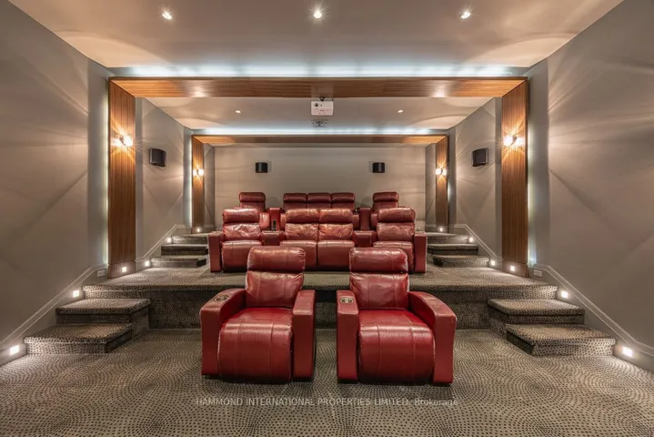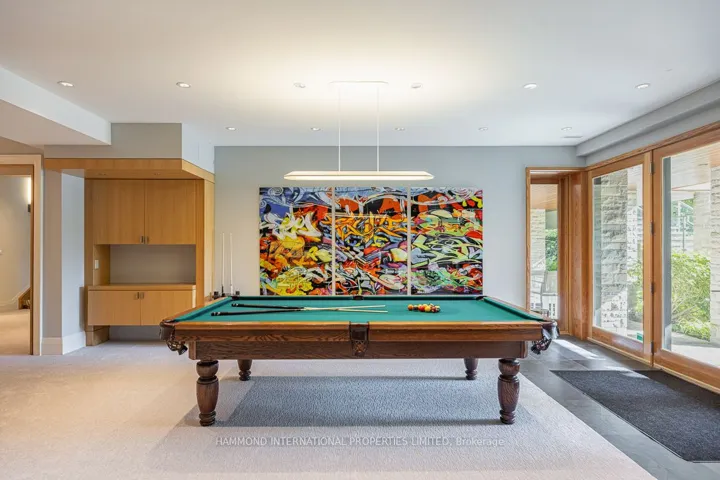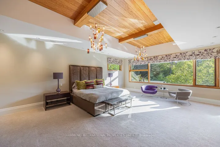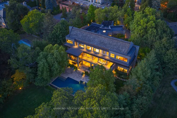 Everscape, A Frank Lloyd Wright Inspired Architectural Masterpiece at 7 Oxbow Road Where Architecture and Nature Become One. Set on 1.38 acres of pristine ravine land, Everscape is a stunning 12,000-square-foot residence inspired by the timeless vision of Frank Lloyd Wright. Designed to harmonize with its natural surroundings, the home integrates stone, wood, and expansive glass to create a seamless connection between architecture and landscape. A circular motor court introduces the property, while walls of windows and soaring ceilings bathe the interiors with an abundance of natural light. On the main floor, a flowing open-concept layout unites principal rooms with rich millwork, a dramatic exposed stone wall, and a striking aquarium touches that add warmth and unique character. The home offers six bedrooms and eight bathrooms, each filled with natural light and treetop views of the 488-foot deep ravine lot. The primary suite is a private retreat with a marble-clad spa ensuite, oversized walk-in closet, and tranquil vistas overlooking the pool and ravine. Entertainment abounds with a state-of-the-art movie theatre seating 11 with a built-in bar, a recreation room, yoga studio, gym, and steam shower. Multiple walkouts connect the interior to the resort-style backyard. The grounds of Everscape evoke the serenity of a private park. Designed for both relaxation and grand entertaining, the property features: A saltwater infinity pool and hot tub suspended over ravine views A tennis / sport court, framed by graceful willow trees An outdoor entertainment pavilion with two barbecues, gas fireplace, television, and lounge space perfect for alfresco dining beneath the moon and stars Here, every moment embraces nature, privacy, and luxury in perfect balance.