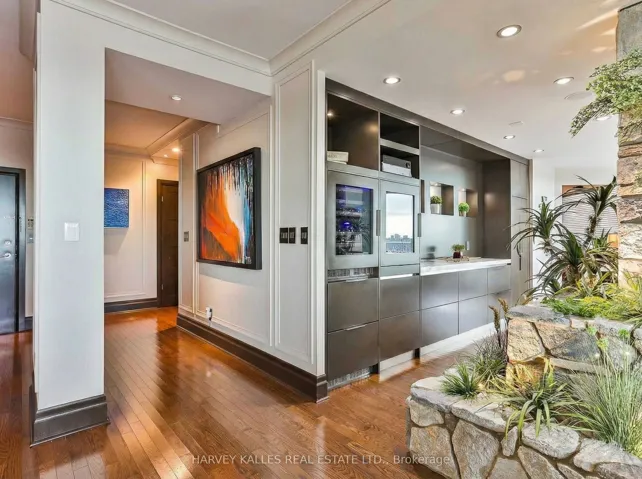 Framed by the endless green canopy of the Rosedale Ravine, this residence commands one of the most coveted vantage points in Toronto. Spanning over 3,000 Sq.ft., it is designed with both elegance and ease in mind. Floor-to-ceiling windows flood the space with natural light, framing uninterrupted majestic views of the Ravine and beyond, while travertine and custom wood-accent walls add warmth and timeless sophistication. The thoughtful split-level layout strikes the perfect balance between connection and privacy, featuring expansive principal rooms, a cozy family room with fireplace, and a chefs kitchen appointed with a Wolf Gas Cooktop, Stainless Steel Appliances, Wine and Beverage Fridges, and a splendid Centre Island with integrated storage making meal prep effortless. A custom-designed servery enhances both everyday living and grand entertaining, while the surround-sound system and independent temperature control zones elevate comfort and convenience. New Hardwood Flooring throughout main living areas. The primary suite is a private retreat, with a sitting area and fireplace, a resort-worthy five-piece ensuite with jacuzzi, a walk-in closet with custom organizers, and a walkout to a private balcony. Two Parking Spaces with EV chargers, all-inclusive Maintenance Fees, and a walkable location in the heart of Toronto mere steps to Yorkville complete this exceptional offering. Residents also enjoy access to the indoor pool, guest suites, and an impeccable 24/7concierge.
