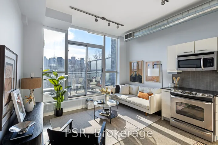 Modern loft living. Unbeatable location. Exceptional views. Welcome to stylish, urban living in the heart of Corktown! This stunning junior 1- bedroom loft offers the perfect blend of modern design and everyday functionality. Soaring ceilings and expansive west-facing windows flood the space with natural light and showcase breathtaking sunset views over the city. Step out onto your private terrace (complete with a gas hookup for BBQ) – an ideal spot for morning coffee, evening drinks, or simply unwinding while taking in the skyline. The sun-drenched kitchen is designed to impress, featuring mostly full-size stainless steel appliances, ample cabinetry, and plenty of prep space – perfect for cooking and entertaining. The open-concept layout maximizes every square foot, while the defined sleeping area offers comfort and privacy. This loft includes a 4-piece washroom, generous storage throughout, plus the convenience of a full-sized stacked washing machine and dryer. Building amenities include: gym, party room, rooftop terrace and meeting room! Commuting is a breeze, being close to several transit lines, and just minutes to the Don Valley Parkway (DVP). Enjoy being steps from some of the city’s best shops, cafes, and restaurants!