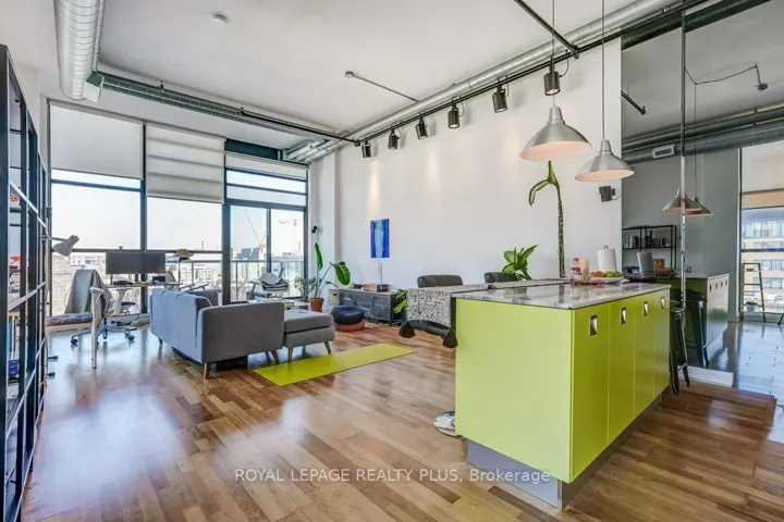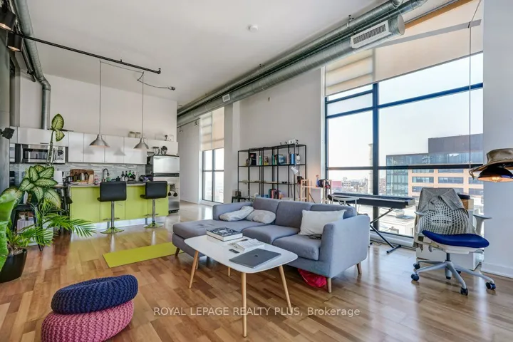 Rarely offered penthouse corner loft at the iconic Toy Factory Lofts. This northwest-facing showpiece delivers lake and skyline views from an expansive 270-degree balcony – a true standout in today’s condo market.Soaring 12′ ceilings and dramatic floor-to-ceiling windows flood the space with natural light, highlighting the authentic character and scale that only a true hard loft can offer. The airy, open-concept layout is ideal for both entertaining and elevated everyday living.The designer Scavolini kitchen makes a bold statement with a marble island, sleek high-gloss cabinetry, and refined finishes that blend modern sophistication with industrial edge. Custom blinds and striking Sun Project architectural shades add both style and comfort.The spacious bathroom features a limestone vanity, oversized mirror, and built-in shelving, creating a clean, spa-inspired retreat.Includes 1 underground parking space – a rare and valuable convenience in Liberty Village. Located in one of Toronto’s most sought-after boutique loft conversions, steps to top restaurants, cafés, fitness studios, parks, transit, and the waterfront.Penthouse. Corner exposure. Iconic building. Parking included. Exceptional views. Opportunities like this are limited – secure your place in one of the city’s most desirable loft communities.