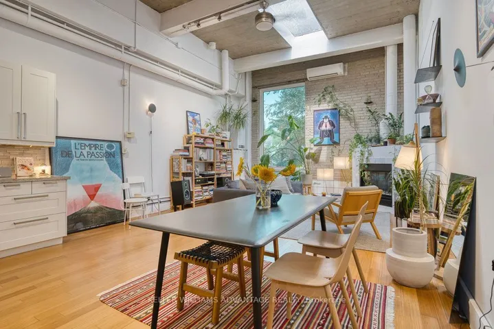 Magnificent, big and bright, two-level loft available in brick and beam factory-loft conversion. Conveniently located in the heart of Toronto on a tree-lined street of Victorian brick homes in Cabbagetown South. Open-concept sky-lit living and dining areas with gas fireplace, hardwood flooring, large window, and soaring 15 foot high ceilings. Spacious kitchen with stainless steel appliances, top of the line WOLF gas stove, abundant counter space, and centre island. Bedroom with hardwood flooring on second floor overlooks the gorgeous main-floor living space. Freshly renovated custom four-piece bathroom. Relaxation awaits on your totally private roof-top terrace. This wonderfully-kept building – formerly the Toronto Evening Telegram – has been converted into just 10 striking residential lofts in this pedestrian-friendly downtown-east community. Loft is zoned as work/live. Mere steps from multiple transit routes, and an easy stroll to the parks, shops and services of Parliament Street. The best of the city awaits! Brand new on-demand boiler installed in 2026.