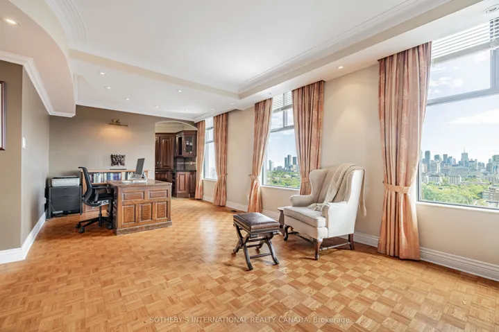 Spectacular 360 city views at Yonge, Avenue & St. Clair. A rare full-floor residence in one of Toronto’s most established and desirable neighbourhoods. Direct elevator access opens into approximately 1,823 square feet of refined living space, wrapped in unobstructed panoramic skyline views from every angle.Designed for both comfort and impact, the suite offers 2 generous bedrooms, 2.5 baths, and a flexible den or sunroom ideal for a home office, library, or quiet retreat. The enclosed sunroom delivers a truly serene experience, surrounded by sweeping city vistas.The open concept living and dining areas are thoughtfully updated with elegant parquet flooring, custom built-in bookcases, and pot lighting throughout. A renovated kitchen features granite counters, quality appliances, and a functional layout suited to both everyday living and entertaining.The primary suite includes a well-appointed 5-piece ensuite. The second bedroom enjoys its own private 3-piece ensuite, offering comfort and privacy for guests or family.One suite per floor ensures an exceptional level of privacy and exclusivity. Additional features include ensuite laundry, one underground parking space, and an out-of-suite locker.An outstanding opportunity just steps to Yonge and St. Clair shops, restaurants, parks, top schools, and the TTC. Luxury living paired with unmatched convenience. Some photos have been virtually staged.