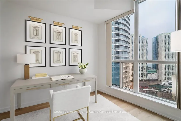 Soar above the skyline in this stunning 18th-floor 1+1 bedroom residence, offering a highly desirable PARKING space, private locker, and breathtaking unobstructed southwest views of Lake Ontario and Harbourfront Centre-a rare gem in Toronto’s coveted waterfront. This 9 ft ceiling beauty is bathed in natural light, the suite features a versatile solarium perfect for a sophisticated home office or creative retreat. The modern kitchen boasts professionally refinished cabinets-a NEW stylish update-granite countertops, a stone backsplash, and a breakfast island flowing seamlessly into the open-concept living area. Thoughtfully styled and NEW professionally painted in designer colours using premium Benjamin Moore paint, the suite feels bright, welcoming, and effortlessly refined. NEW professionally laid modern flooring extends throughout main areas, creating a seamless, elevated aesthetic. The private primary bedroom is a tranquil retreat with a well-appointed ensuite featuring a floating vanity, under-mount lighting, and built-in storage, while a chic powder room offers added convenience for guests. Additional highlights include in-suite laundry discreetly tucked away, NEW tasteful light fixtures, and a functional, move-in-ready layout. Situated in a prestigious Waterclub residence, residents enjoy 24-hour concierge service and secure fob-controlled elevator access. This exceptional condo effortlessly blends luxury, comfort, and an unbeatable location-just steps to the TTC, scenic waterfront trails, hop on a ferry to centre island, enjoy premier dining, shopping, and the Financial District-all at a remarkable value, making this a smart opportunity for a savvy buyer to secure a prime property before the market shifts. Can a peaceful feeling and lake views truly coexist within a bustling city? It’s rare-but this residence proves you can have both. Photos in this listing have been virtually staged for your enjoyment-original photos of the vacant unit are in the gallery.