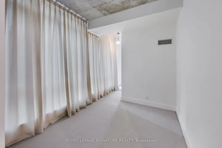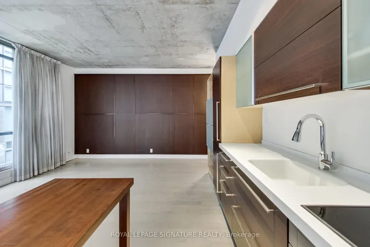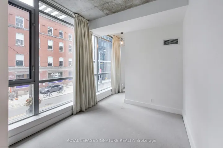 Welcome to the iconic Charlotte Lofts, a stunning 884sqft one bedroom corner loft in an exclusive 63-suite boutique building, perfectly situated in one of Toronto’s most walkable, energetic neighbourhoods. Steps to King West, Queen West, and the Financial District, you’re surrounded by the city’s best dining, nightlife, shopping, and transit. This sun-filled loft blends industrial character with modern design, featuring soaring exposed concrete ceilings, a statement column, and wrap-around floor-to-ceiling windows with blackout blinds. The expansive living/dining area with a wainscoting feature wall offers exceptional flexibility for entertaining or working from home, with a Juliette balcony showcasing southeast city views. The Scavolini kitchen is sleek and functional with Corian counters, built-in stainless steel appliances, ample storage, and a movable island. Incredible custom storage solutions-including a front hall closet and a den converted into a massive walk-in closet, add thoughtful luxury. The primary suite features floor-to-ceiling windows, built-ins, and a spa-like 4-piece bath with dual rainfall shower heads. A true statement loft in an unbeatable downtown location. Hydro, water, heat, and central air are all included in monthly fees.