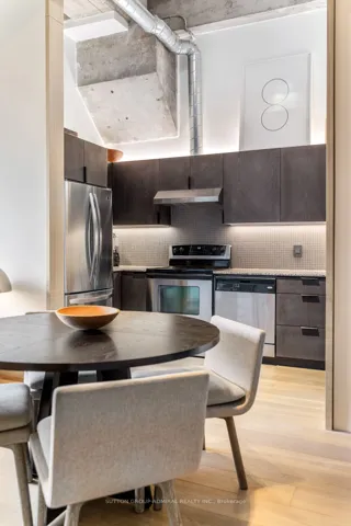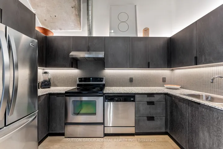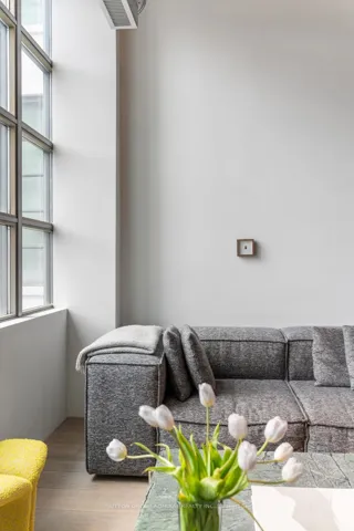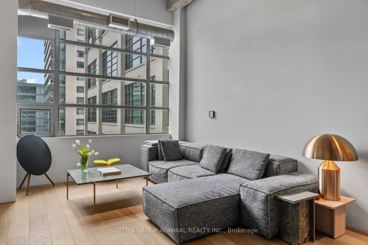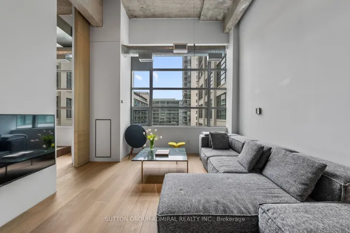 This beautifully customized loft was thoughtfully designed by a multi-ward-winning international designer, with a focus on quality, detail, and timeless style. Wide-plank smoked European oak flooring runs throughout, complemented by extensive custom millwork, integrated lighting, and premium finishes that create a cohesive and highly considered interior. The bathroom is finished in large-format limestone with custom millwork, a marble vanity, and ultra-premium plumbing fixtures. Large south-facing windows overlook the rooftop terrace and fill the space with natural light, while automated window coverings provide everyday ease and comfort. The bedroom is bright and inviting, and the expansive mezzanine offers exceptional flexibility, ideal as a second bedroom, home office, or creative studio. The mezzanine also extends the living space beyond the stated 739 sq.ft. enhancing both functionality and the overall spatial experience of the suite. Set within Tip Top Lofts, this is a rare opportunity to own a truly one-of-a-kind designer residence in one of Toronto’s most iconic buildings.