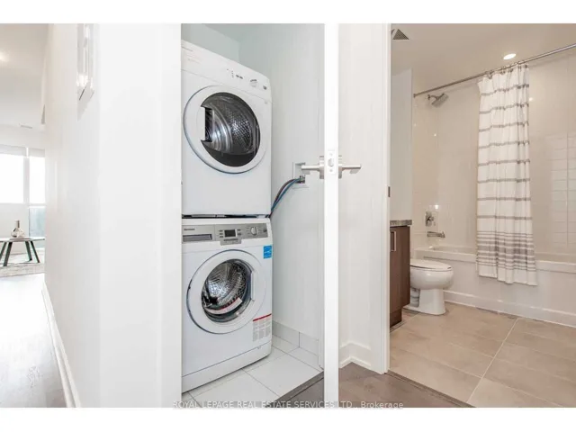 Welcome to Rise Condominiums, where modern design meets effortless midtown living. This thoughtfully designed suite offers a bright, open-concept layout with a highly functional flow, making the most of every square foot. The contemporary kitchen is both stylish and practical, featuring warm wood cabinetry, stone countertops, and a sleek tile backsplash. A mix of integrated and stainless steel appliances creates a streamlined, high-end look while maintaining everyday ease. Designed along one wall, the kitchen connects seamlessly to the living and dining area, ideal for both entertaining and comfortable daily living. The living space is filled with natural light from expansive windows, with a walkout to a private balcony equipped with a natural gas hookup for a barbecue, ideal for effortless indoor-outdoor living. A striking exposed concrete column adds a subtle loft-inspired edge while introducing architectural character. The sleeping area is thoughtfully positioned and enclosed with full-height sliding glass doors, offering privacy while maintaining an airy, loft-like feel. Clean lines, wide-plank flooring, and efficient use of space enhance both comfort and functionality. The bathroom is finished with a stone-topped vanity, modern fixtures, and a full tub and shower combination. A defined entry foyer and smart storage solutions complete the suite. Residents enjoy an exceptional, resort-style amenities, including a 24-hour concierge, fully equipped fitness centre, yoga studio, sauna, party and dining room, theatre/media lounge, games room, guest suites, and visitor parking. The rooftop experience is a true highlight, featuring an outdoor pool, lounge areas, and beautifully designed terraces with BBQs, perfect for relaxing or entertaining in the warmer months. Perfectly located in the vibrant St. Clair West neighbourhood, steps to transit, cafés, restaurants, and boutique shops, and within easy reach of Wychwood Barns, parks, and ravine trails.