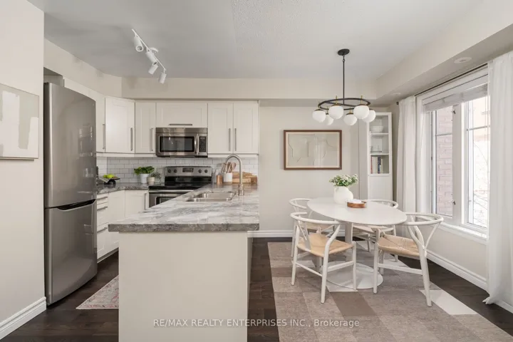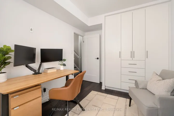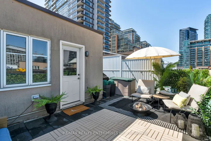 In the heart of Liberty Village, you will love this move in ready beautifully renovated townhome. Offering 971 sqft of thoughtfully designed interior space plus an impressive 260 sqft private rooftop terrace. Featuring 2 bedrooms, 1.5 bathrooms, 1 underground parking space and 2 storage lockers, this home blends modern updates, functional living and the convenience of city living. The upgraded kitchen is both stylish and practical, complete with Quartz countertops, stainless steel appliances, under-cabinet lighting and ample storage. The open-concept living and dining area is enhanced with pot lights and hand-scraped hardwood flooring throughout – no carpet. Two spacious bedrooms offer excellent natural light and custom built-in closets, providing both comfort and organization. Additional upgrades include new interior doors and hardware, and a stylish barn door enclosing the laundry area. You will love the large private rooftop terrace – a true outdoor extension of your living space. Soaked in sunlight throughout the summer months, it’s ideal for grilling (with gas line), hosting dinners, and relaxing. A/C replaced three years ago, **Kitec plumbing replaced in 2018 (paperwork available).** Situated on the quiet side of the complex facing away from the street creates a peaceful pocket to call home in one of Toronto’s most vibrant communities. Grab a coffee from Balzacs or Arvo and explore the many parks and Martin Goodman Trail. You will love having awesome cafes, restaurants, fitness studios, and boutique shops in your neighbourhood, with easy access to transit, the waterfront, and major highways. Liberty Village offers the perfect balance of urban convenience and neighbourhood charm – an ideal place to call home. *Offers anytime!*
