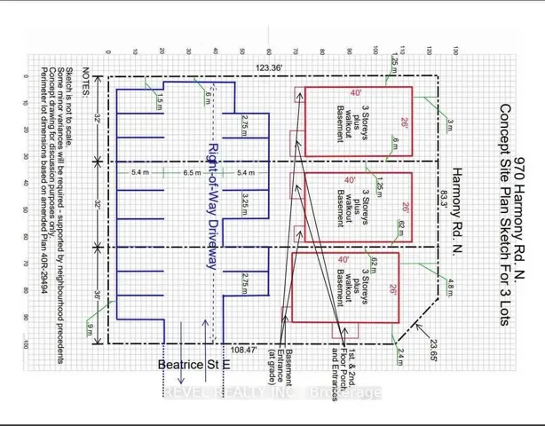 Attention Builders & Investors – Prime Development Opportunity in North Oshawa! Situated on a pie-shaped corner lot with 100′ rear frontage, this parcel is ideal for severance into 3 lots with potential for 3 detached homes, each supporting 3 units per dwelling (total of 9 units) under the More Homes Built Faster Act, 2022 – allowing for 2 accessory units in each single-family home without development charges or parkland fees. Zoned R2 with services available. Buyer to conduct own due diligence. Property being sold “As-Is” with an unused well in the rear yard (as per seller). Located at the corner of Harmony Rd N & Beatrice St E – close to schools, parks, transit, and all amenities.
