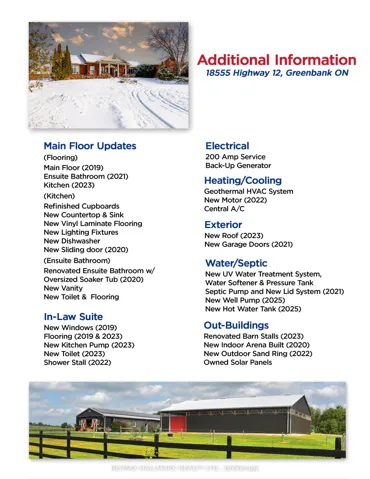 Live your dream on this lovely equestrian estate, located just 20 km north of Whitby and perfectly positioned between Port Perry and Uxbridge. Set on 29.79 picturesque acres, this exceptional turnkey property features expansive paddocks, electric fencing, and pristine bush/forest to explore. The property has been lovingly operating as a successful equine business for years. CURRENT OWNER IS NOW RETIRING AND IS MOTIVATED TO SELL ! Continue an income generating enterprise or simply enjoy your own private horse-lover’s retreat, the possibilities here are truly endless. Home and outbuildings are thoughtfully positioned to offer exceptional privacy, set well back from the road and backing onto nearly 900 acres of MNR land – a truly peaceful and scenic setting. 30′ x 68′ insulated & renovated 10 stall barn with 200 amp service. New indoor arena constructed in 2020. 8 large paddocks, some with run-in sheds, hydro and water. New Outdoor Sand Ring (2022). This property shows a 10+ ! Large, energy e Rated bungalow with numerous updates, improvements and renovations. 2590 sq.ft. on main level combines with approx. 1995 sq.ft. of lower level living space for over 4500 sq. ft. of total living space. The large main living room features a wood burning fireplace and overlooks the paddocks. New flooring throughout the main and lower level. Updated country kitchen with new quartz counter-tops. Renovated ensuite bathroom with oversized soaker tub. Fully finished basement with 3 BR in-law suite/apartment, including IKEA kitchen and separate laundry facilities. All new basement windows. Spacious 3 car garage with new doors and windows and 2 built in workbenches and mezzanine for storage. Geothermal heating & cooling for year round comfort and savings ! Managed Forestry Plan to reduce property taxes. New UV water filter, softener, and pressure tank. New well pump (2025). Owned solar panels generate approx. $5500-$6500 annual income. A fantastic opportunity with strong investment appeal.