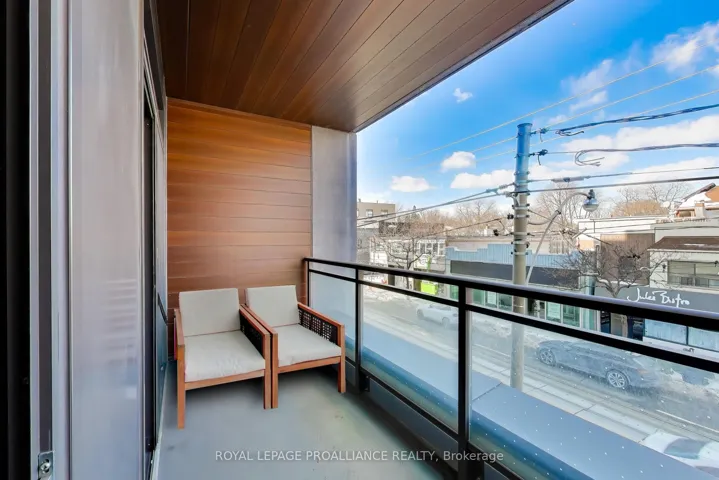 Welcome to The Poet, an intimate boutique residence in the heart of Leslieville. This highly sought after 2nd floor corner suite offers desirable north exposure and beautiful natural light throughout the day, with open views along vibrant Queen Street East. Thoughtfully designed, this spacious 2 bedroom plus large den layout stands apart. The second bedroom includes an east-facing window that brings in gorgeous morning light, creating a bright and comfortable space. The oversized den offers true flexibility and is ideal for a dedicated home office, library, nursery, or guest area. The open concept living and dining space flows seamlessly from a sleek modern kitchen with integrated appliances and contemporary cabinetry. Nine-foot ceilings and floor to ceiling windows enhance the sense of space and light, while the corner positioning adds privacy and an airy feel throughout. A standout feature is the generous 119 square foot balcony, accessible from both the living room and the primary bedroom. This expansive outdoor space truly extends your living area and provides the perfect setting for outdoor dining, entertaining, morning coffee, or relaxed evenings. For added convenience, the locker is located right outside the unit. Residents enjoy premium building amenities including a concierge, rooftop Sky Garden with gas BBQs and lounge seating, a fully equipped and modern gym, a stylish party room with wet bar, theatre screen and plush seating, a pet spa, an in-house bike repair station, and direct access to Maple Leaf Forever Park. With the 24 hour Queen streetcar just steps from the door and the Martin Goodman Trail nearby, this location offers seamless connectivity in one of Toronto’s most sought-after neighborhoods.