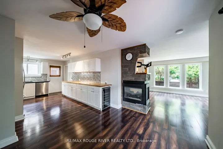 In a coveted South Ajax lakeside community, set on a private mature treed lot, this renovated bungalow with 3+2 bedrooms and three full bathrooms offers the rare advantage of a legal duplex generating approximately $54,000 in rental income annually, plus utilities. A sheltered portico entry welcomes you into an inviting foyer that opens to a private office/den on one side and a spacious living room enhanced by a contemporary three-sided fireplace that also warms the dining area. The expansive chef’s kitchen features quality finishes and a walkout to a large fenced side deck with a gas BBQ line, perfect for entertaining. The primary bedroom includes a renovated 3-piece ensuite with an oversized glass shower. Good sized secondary bedrooms offer outstanding custom closet built-ins, complemented by a renovated main bath. For convenience, there are two separate laundry areas, one for each unit. From the front door you are ideally located a short walk to Ajax’s scenic waterfront trails, Rotary Park, Duffins Bay Beach, and well-regarded local schools, with excellent proximity to transit, dining, and shopping… and just steps from Exeter Park offering a playground, splash pad, and a leash-free dog park with separate areas for large and small dogs. This is an exceptional opportunity with a substantial mortgage helper income of approximately $4,500 per month with tenants paying the utilities. The lower unit will be vacant on closing, offering flexibility for owner occupancy or tenant selection. Conveniently located minutes to the GO