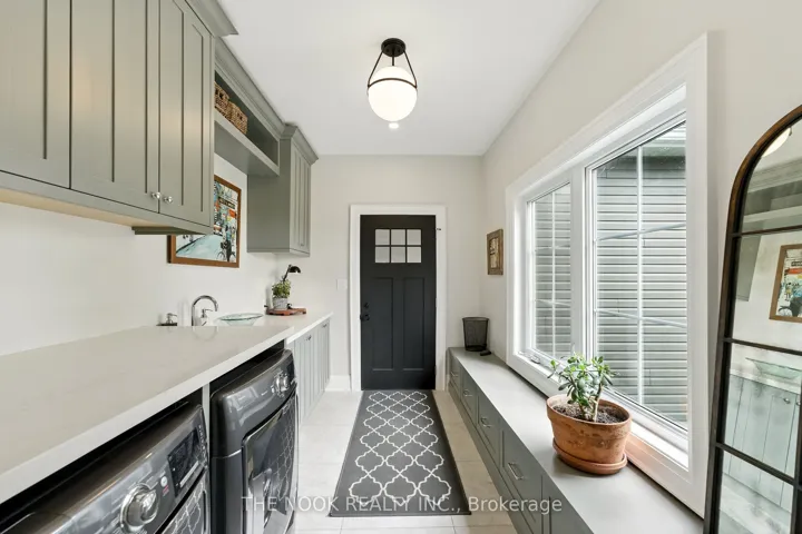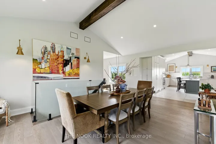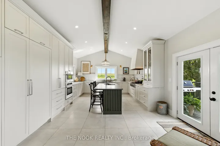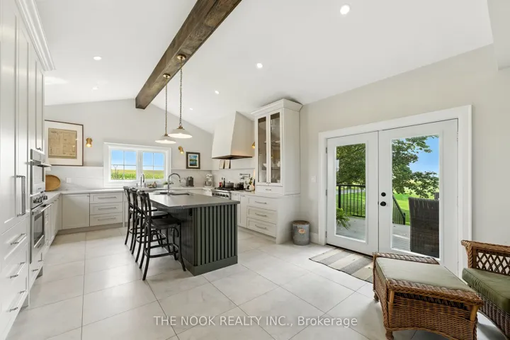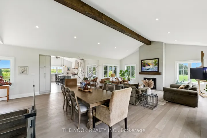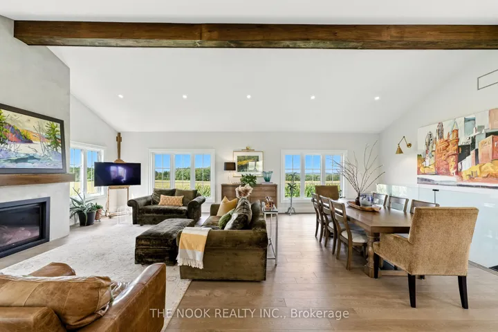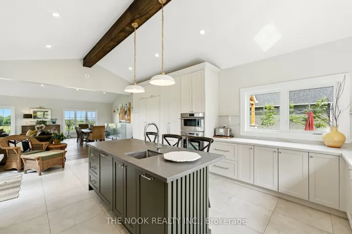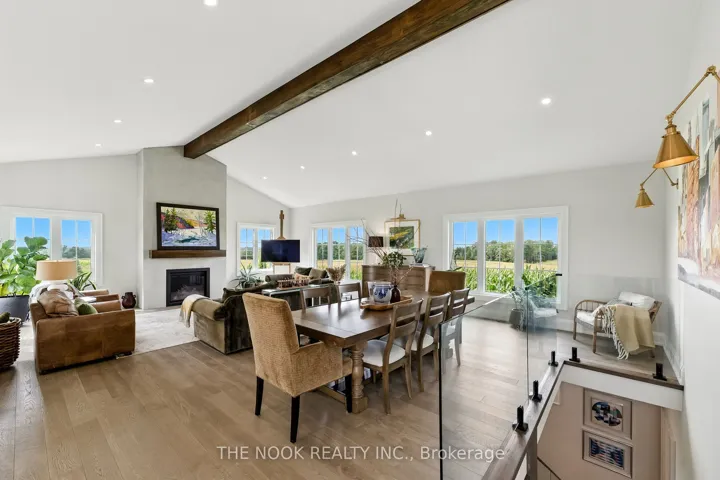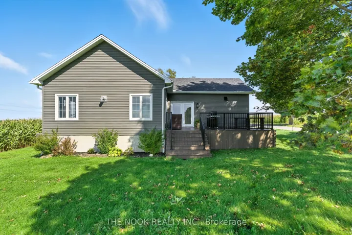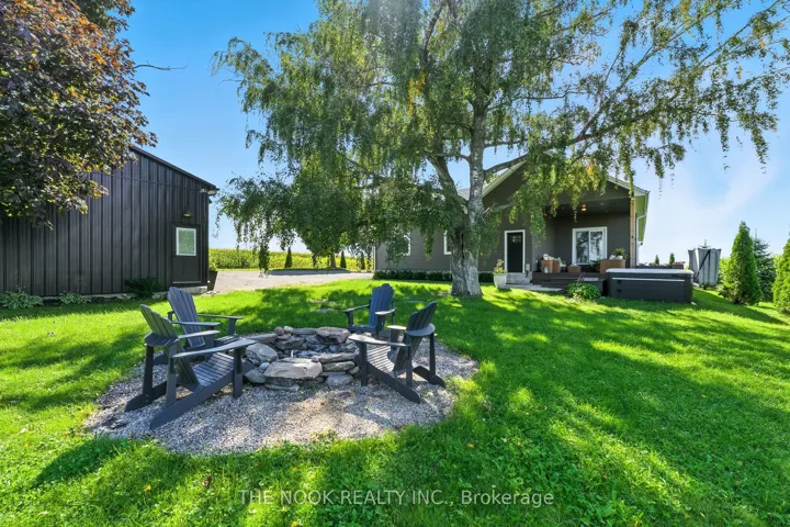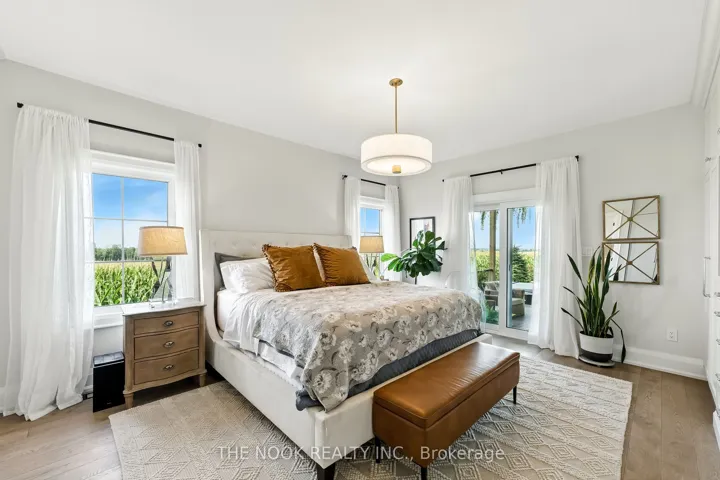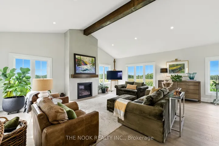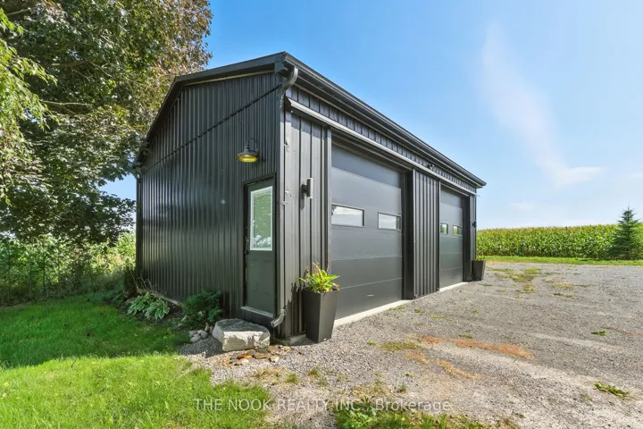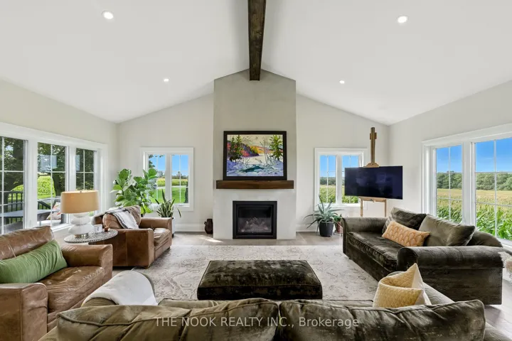 Welcome to this custom-built luxury bungalow on 1.54 acres of private countryside, offering modern comfort with timeless rural charm. A tree-lined driveway leads to beautifully landscaped grounds, a welcoming front porch, & multiple outdoor living spaces, including a raised deck & spacious patio for entertaining. The main level of this home is thoughtfully designed to combine everyday functionality with elegant style. A welcoming foyer with a double closet leads into the open-concept living spaces, where soaring ceilings with wood beams, expansive windows, & a striking fireplace create a bright & inviting atmosphere. The chefs kitchen is a true highlight, featuring high-end appliances, custom cabinetry, a large center island, & a walkout to the deck. Seamlessly connected, the dining area & living room provide an ideal setting for gatherings, with natural light flooding the space from every angle. The primary retreat offers built-in cabinetry, a luxurious 5-piece ensuite with soaker tub & glass shower, & private access to the deck. A second bedroom, currently staged as a home office, adds convenience for guests. Completing the main floor is a well-equipped laundry & mudroom with direct access to the attached garage. The fully finished lower level extends the living space beautifully. A wide staircase with glass railing opens to the rec room, complete with a sleek wet bar, custom built-in shelving, & a cozy fireplace. A glass-enclosed gym provides a dedicated space for fitness while maintaining an open, modern feel. Two generously sized bedrooms, each with large above-grade windows, are complemented by a stylish 4-piece bathroom. The lower level offers the ideal blend of relaxation, recreation, & practicality, while also housing a utility room for added convenience. With an attached garage plus a detached workshop, this property is ideal for both relaxation & practicality, all while surrounded by sweeping farmland views & just minutes from nearby amenities.