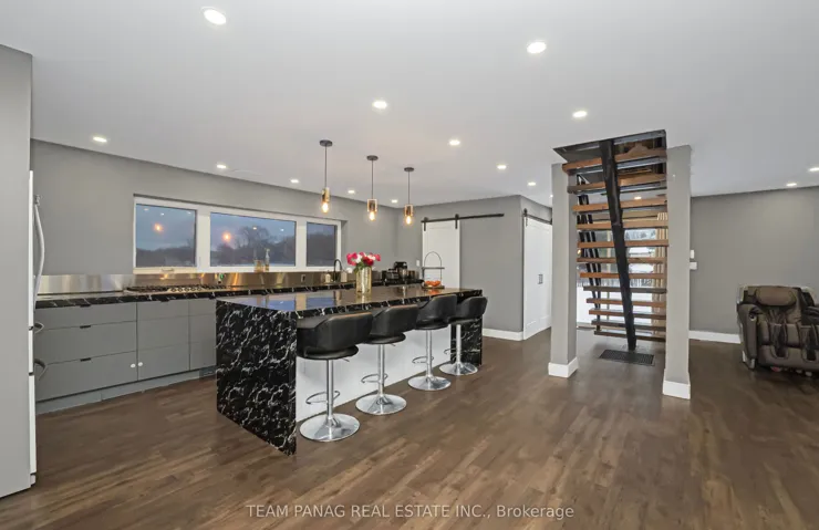 A Home That Truly Must Be Seen to Be Appreciated! Step inside this beautifully designed open-concept home where every detail has been carefully considered. The main level offers a bright, spacious layout perfect for everyday living and elegant entertaining. The chef’s kitchen features generous counter space, custom concrete countertops, and a large center island with built-in appliances, designed to be both functional and stylish. A walk-in pantry keeps small appliances out of sight, while oversized windows fill the space with natural light and showcase stunning views. A striking custom staircase, crafted with reclaimed wood from the historic Well and Canal, adds warmth, character, and unique charm. Upstairs, the primary suite is a peaceful retreat with sweeping views, a spa-style ensuite, and a large walk-in closet with room for a sitting area or home gym. The soaker tub, perfectly placed to overlook the horizon, is ideal for relaxing. Two additional bedrooms are spacious and bright, with a second full bathroom that continues the spa-inspired design, featuring a sleek glass-and-tile shower and serene rural views. Outside, a generous patio captures golden sunsets and pastoral scenery, perfect for unwinding or entertaining. Adding versatility, a ground-level one-bedroom apartment with heated floors offers comfort year-round, ideal for extended family or rental income. An oversized three-car garage provides ample storage for recreational gear, with easy access to nearby snowmobile and ATV trails. This exceptional home is more than a residence-it’s a lifestyle. Schedule your private viewing today to experience its charm, functionality, and optional furnished living