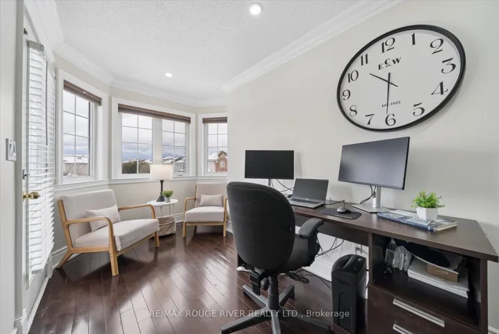 Welcome to Liberty Crossings, one of North Bowmanville’s desired family neighbourhoods. This impressive 5-bedroom, 3-bathroom residence offers 2,721 sq. ft. of meticulously maintained living space designed for comfort, functionality, and style. The main floor features a bright, spacious front foyer, 9-ft ceilings, pot lights, and rich hardwood flooring throughout. A main floor laundry room with direct garage access adds everyday convenience. The upgraded eat-in kitchen is the heart of the home, complete with quartz countertops, upgraded stainless-steel appliances, tons of cabinetry, flowing seamlessly into the inviting family room. Here, a gas fireplace with custom built-in cabinetry creates the perfect atmosphere for both relaxation and entertaining. The upper level showcases five generously sized bedrooms, ideal for growing families or those needing extra office or guest space. The primary retreat offers a quiet escape, featuring a large walk-in closet and a spacious 5-piece ensuite. The beautifully renovated second bathroom includes double sinks and a modern glass shower, providing both luxury and practicality for busy mornings. An additional bedroom with its own private balcony adds a rare and charming architectural touch. The double car garage offers excellent storage capabilities, making this home as functional as it is elegant. Perfectly situated within walking distance to schools, parks, shopping, dining, and essential amenities, with everything conveniently located within 1 km. This is a prime opportunity to secure a spacious family home in a highly sought-after community.