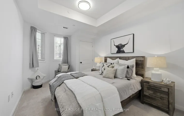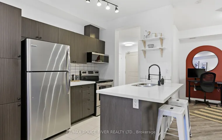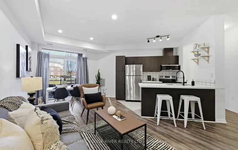 Welcome to 84 Aspen Springs Unit 106. Step into effortless condo living with a layout that truly sets this unit apart. Unlike the standard floor plans in the building, this suite offers a unique design that enhances both flow and functionality. The open-concept living and dining area feels bright and welcoming, ideal for everyday comfort or hosting guests. The kitchen is well-appointed with quartz countertops, an undermount sink, modern backsplash, and a peninsula with breakfast bar seating. A separate den provides a flexible space-perfect for a home office, reading nook, or additional dining area. The primary bedroom features large closet and semi-ensuite access. Located on the first floor for ultimate convenience, enjoy easy entry and a parking space just steps from the building entrance-ideal for daily living and carrying groceries with ease. Unwind on your private balcony overlooking the courtyard. Minutes to shopping, restaurants, transit, movie theatre and Hwy 401. Amenities include gym, party/meeting room, visitor parking, and playground.