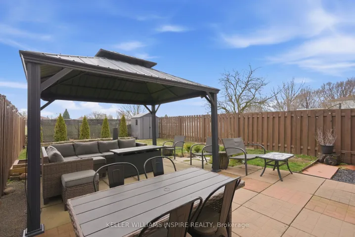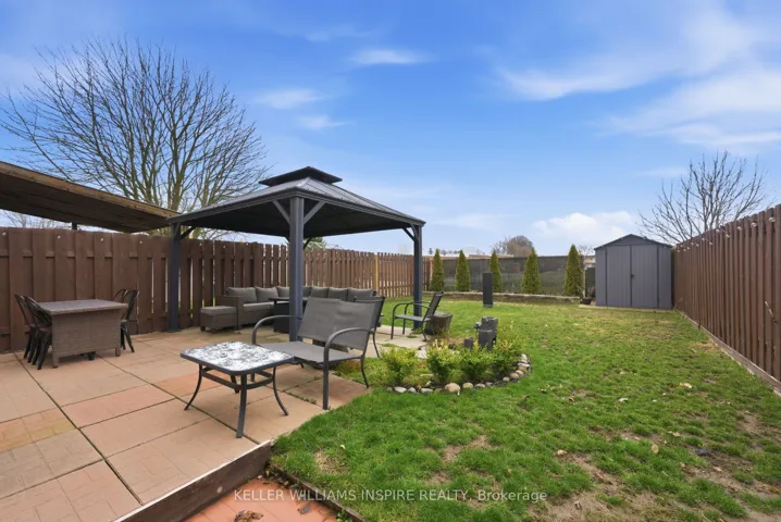 Welcome to court living at its finest! This 3-bedroom semi-detached home offers the rare luxury of backing onto a park/school with no rear neighbours. The main level boasts an eat-in kitchen, 2-pc bath, and a bright living/dining area leading to a spectacular backyard (updated 2023) featuring a patio and gazebo-perfect for entertaining. Upstairs features three spacious bedrooms and an updated (2024) bathroom. The finished basement provides the perfect “bonus” space for families. With a 1-car garage and a rare 4-car driveway, parking is never an issue. Bell Fibe available. Ready to move in and enjoy! **UPDATES: upstairs bathroom (2024), water softener (Jan 2023), smart baseboard thermostats in living room and bedroom (2023), backyard (May 2023).