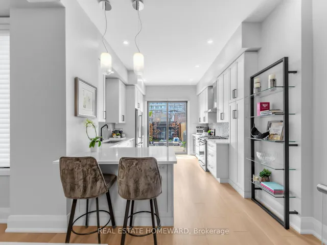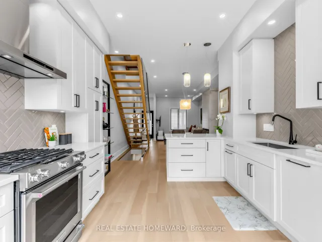 Welcome to this stunning, design-forward home in the heart of Leslieville, offering exceptional finishes and a thoughtfully curated layout. The bright, open-concept main floor features soaring 10′ ceilings, wide-plank white oak flooring, and a sleek electric fireplace set within a marble surround. Large east and west-facing window fills the space with natural light, while the modern staircase with glass railings adds architectural elegance. The chef-inspired kitchen is both stylish and functional, showcasing custom cabinetry with extra-tall uppers, Caesarstone countertops, and a porcelain herringbone backsplash. Premium stainless steel appliances, including a gas range, French-door fridge, wine fridge, and integrated dishwasher, elevate the space. A large sliding door opens to the beautifully landscaped backyard-perfect for entertaining. Upstairs, spacious bedrooms offer 9′ ceilings, solid wood doors, and custom closet organizers. The primary retreat is a true standout, featuring dramatic vaulted ceilings and a walk-in closet. The spa-like ensuite includes a glass shower with rain head, floating double vanity, and designer fixtures. The exterior is equally impressive with professionally landscaped front and backyards, stone walkways, and a lower patio area in the backyard ideal for relaxing or hosting. Additional highlights include composite front decking with glass railings, backyard deck with gas BBQ line, and a custom carport with garage access. A rare blend of modern design, luxury finishes, and prime Leslieville living-this spacious home is truly move-in ready.