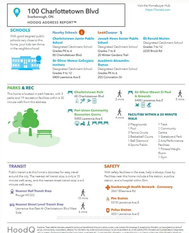Welcome to 100 Charlottetown Blvd lovingly owned and maintained by the same owners since 1974! It’s a 4 level 4-bed backsplit with hardwood throughout. This pride of ownership home features a renovated kitchen with quartz counters, marble backsplash with stainless steel appliances undermount lighting & tile floors. The bright living/dining room is combined for entertaining, plus a tiled breakfast area overlooks the cozy family room. The 2 bathrooms have also been thoughtfully renovated in a calm palate with marble counters and tile floors. Most of the light fixtures have been replaced with ESA approved LED lights. This home features a large main level family room with a granite wood burning fireplace, that walks out to a back deck. A peaceful covered Front porch ideal for morning coffee or afternoon drinks with neighbors/friends. Large pool sized backyard with deck plus a Side entrance, double car garage. The basement is unfinished where you could add a gym, or office or rec space plus there is a huge crawl space for storage. Lots of additional upgrades (Furnace & A/c 2017, Roof & Gutter guards ’23, Washer/dryer ’21, Dishwasher ’20) Most of the windows have been upgraded to Vinyl Thermal (except front & basement) Garage door & electrical panel upgraded (including 2026 ESA certificate)+++ Located in the heart of Centennial Scarborough, close to Rouge GO Station, Port Union Community Centre, Rouge Beach, Lake Ontario, & waterfront trails. Surrounded by top-rated schools, including UTSC, as well as parks, tennis courts, shopping, dining, and quick access to Highway 401.Opportunities on streets like this are rare – don’t miss your chance to call it home. Home inspection available upon request.