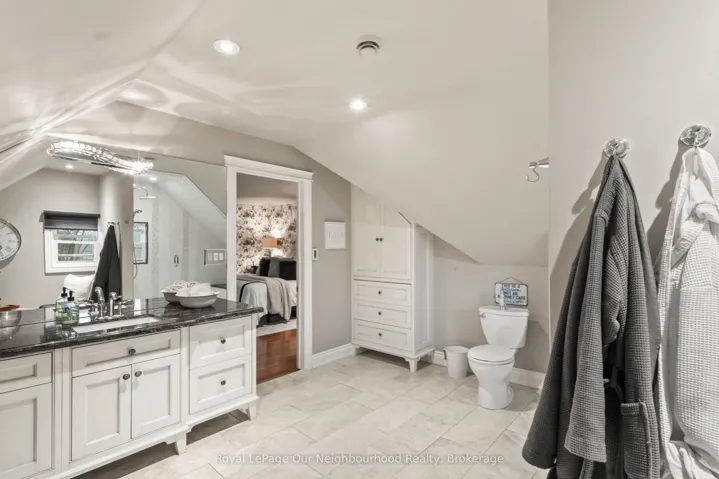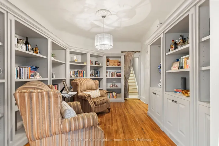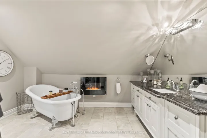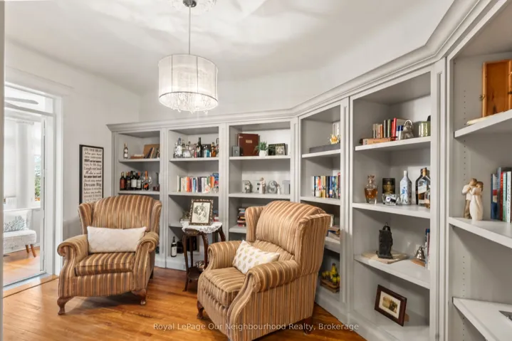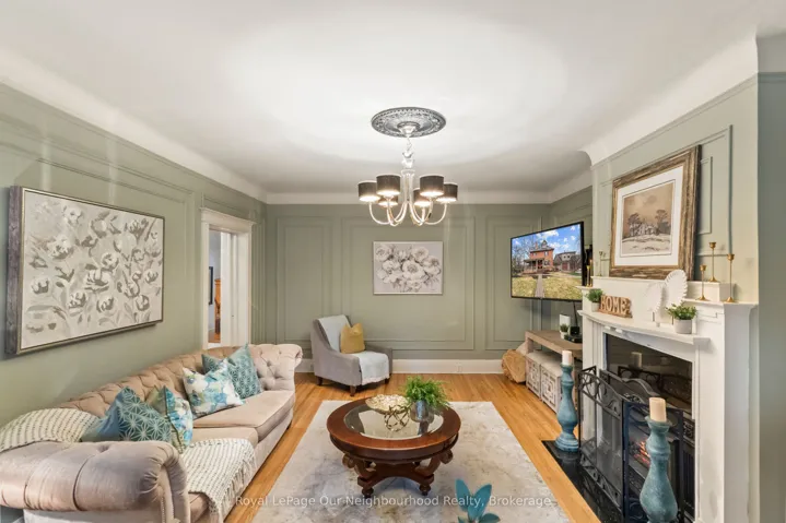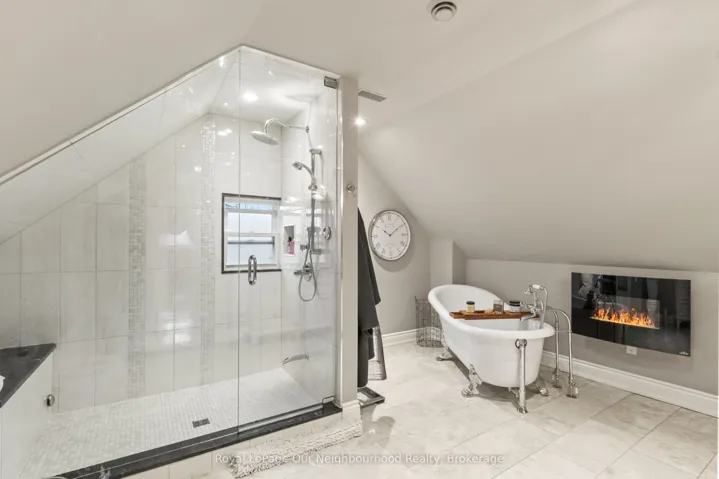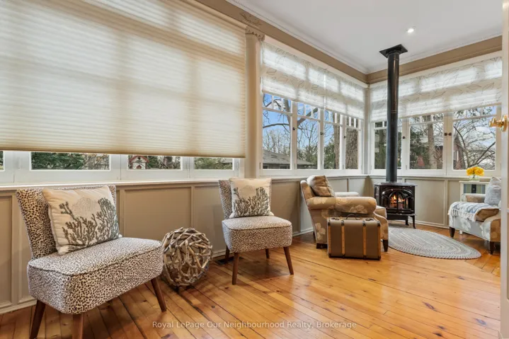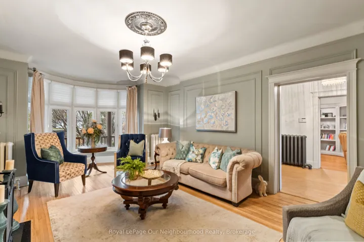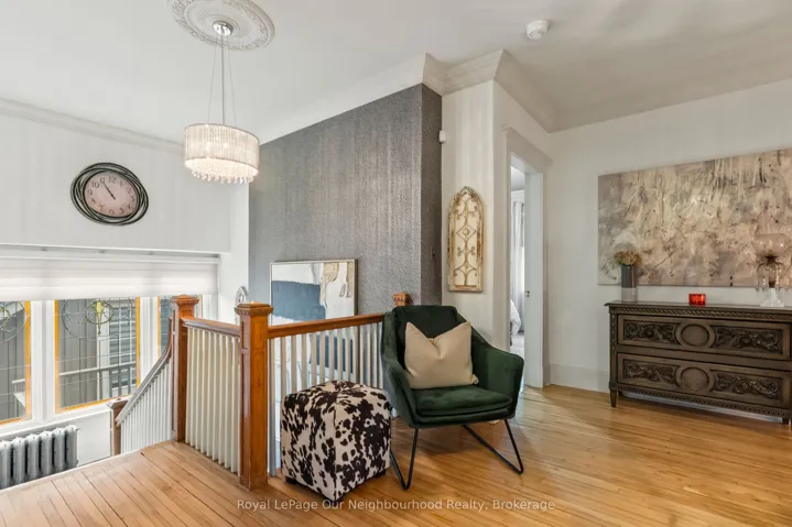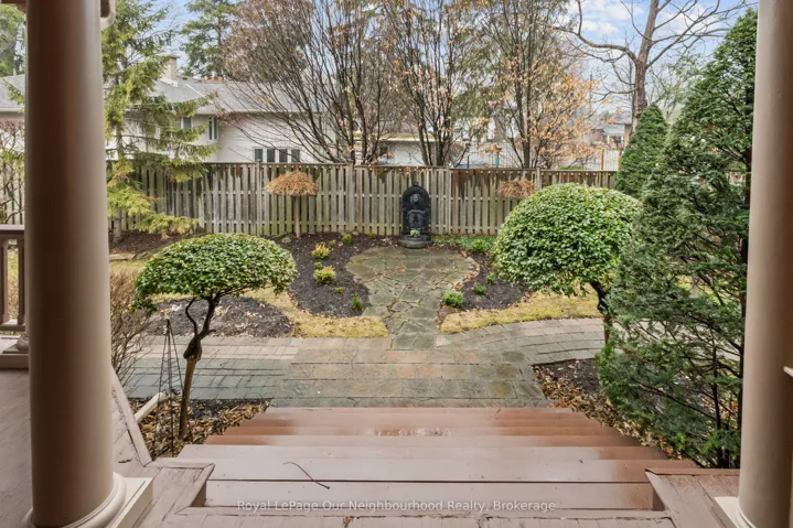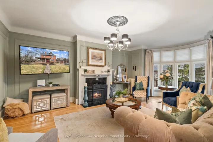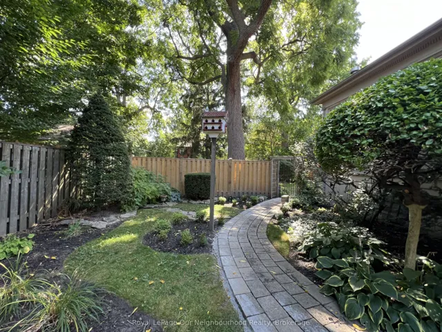 Create your very own Downton Abbey and experience the perfect blend of historic charm and contemporary elegance. This remarkable residence showcases timeless character alongside modern finishings, inviting you to live your best life surrounded by beauty and sophistication.From the moment you enter, soaring grand ceilings on both the main and second floors set the tone for the home’s stately presence. Original hardwood floors span the first two levels, preserving the rich charm of yesteryear, while tasteful decor and oversized rooms create an atmosphere of refined comfort.The beautifully appointed kitchen features travertine flooring, an inviting eat-in area, and a walkout to the backyard oasis. Enjoy quiet mornings or evening gatherings on the cozy wrap-around porch with pot lights, or in the enclosed sunroom overlooking lush, English-inspired gardens and a tranquil babbling brook pond.Upstairs, each spacious bedroom offers walk-in closets and grand ceilings, while the large laundry room-with its own walkout to a deck-makes chores a pleasure. The deck connects to a private gym and 3-piece bath located above the heated garage.The third floor is your private master retreat-a true sanctuary featuring a wraparound walk-in closet with custom built-ins, corner gas fireplace, and a stunning en-suite. Relax in the claw-foot tub or steamer shower, warmed by the gentle glow of a Napoleon electric fireplace. The large heated loft garage includes hydro, a garage door openers with remotes, and access from both the backyard and laundry room.Outdoors, the property is an absolute haven. Set on a rare double lot, the backyard offers mature perennial gardens, two ponds, a serene fire pit area, and a new fence providing privacy and peace. Enjoy natural gas hookups for your BBQ and future outdoor fireplace-perfect for entertaining in every season. New Fencing installed Fall 2024. Survey on File 2023. Walking distance to Trafalgar Castle (Private School) and Henry St High.