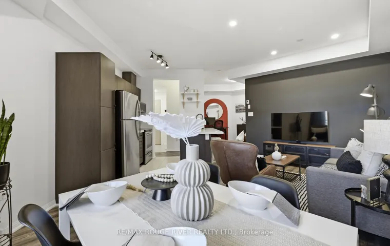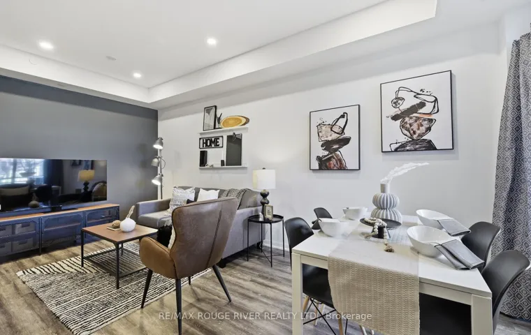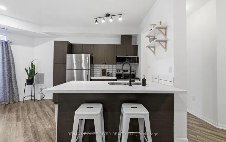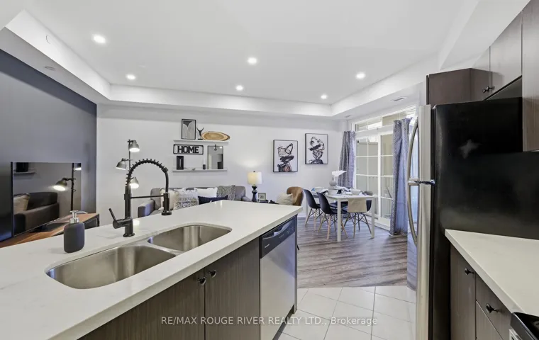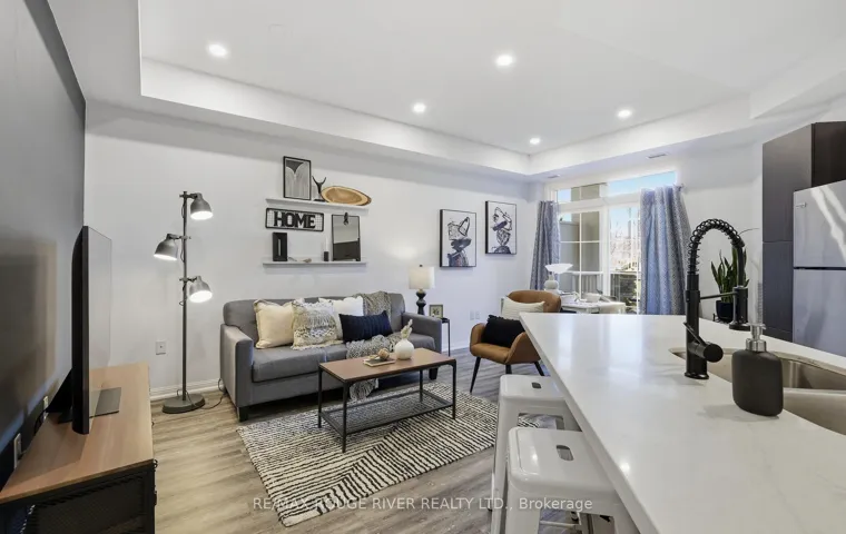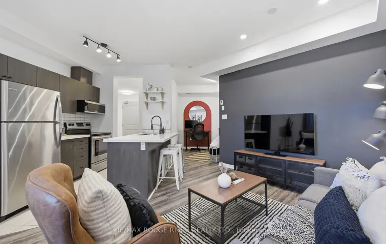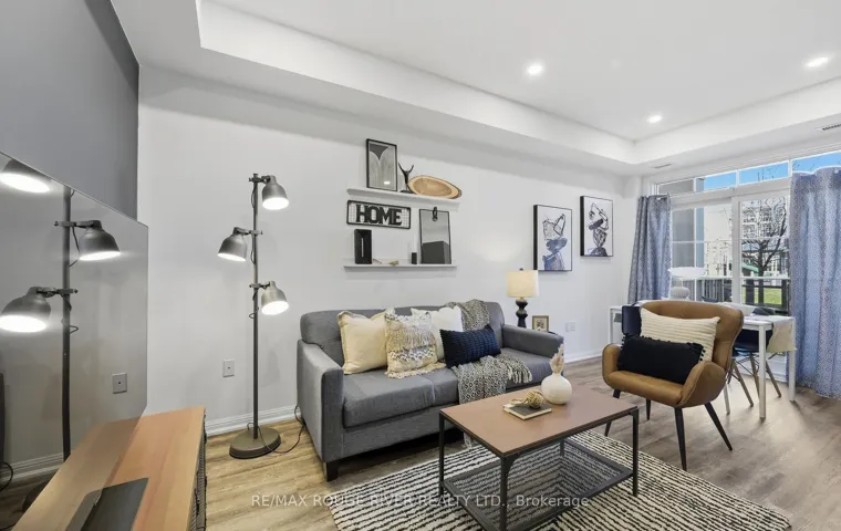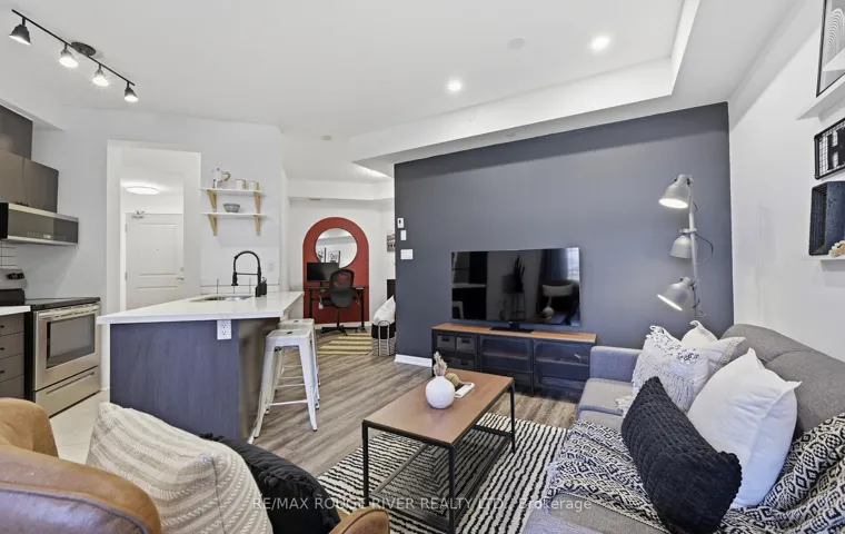 Welcome to 84 Aspen Springs Unit 106. Step into effortless condo living with a layout that truly sets this unit apart. Unlike the standard floor plans in the building, this suite offers a unique design that enhances both flow and functionality. The open-concept living and dining area feels bright and welcoming, ideal for everyday comfort or hosting guests. The kitchen is well-appointed with quartz countertops, an undermount sink, modern backsplash, and a peninsula with breakfast bar seating. A separate den provides a flexible space, perfect for a home office, reading nook, or additional dining area. The primary bedroom features a large closet and semi-ensuite access. Located on the first floor, this unit offers true everyday convenience with direct, stair-free access, no elevators, no waiting, just easy in-and-out living. With parking just steps from the entrance, daily routines like carrying groceries or coming home at the end of the day are seamless. Unwind on your private balcony overlooking the courtyard. Ideally situated minutes to shopping, restaurants, transit, a movie theatre, and Hwy 401. Amenities include a gym, party/meeting room, visitor parking, and playground