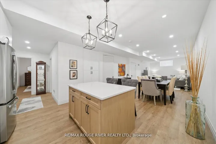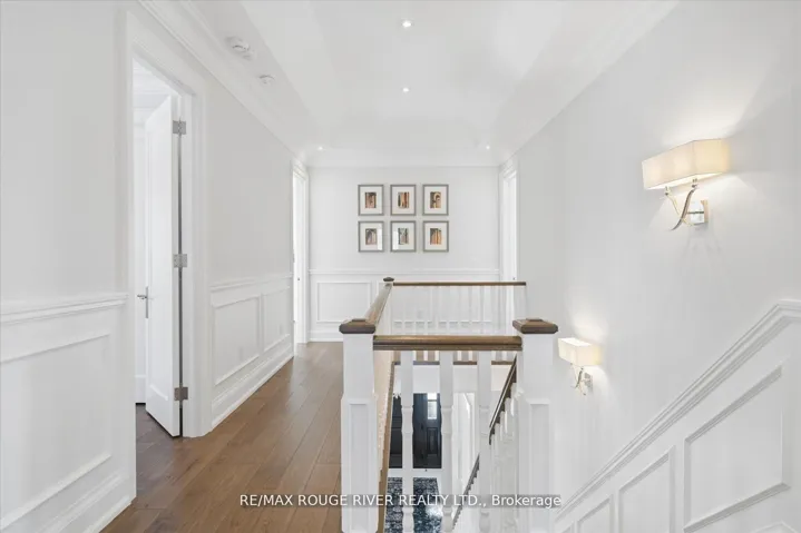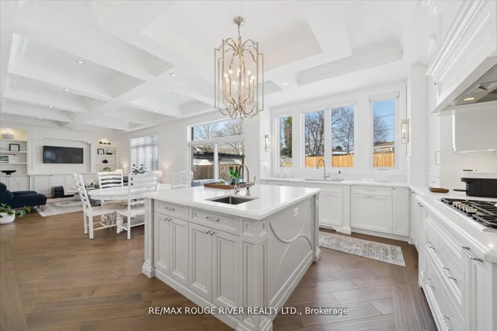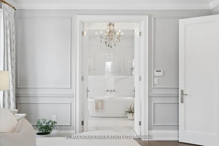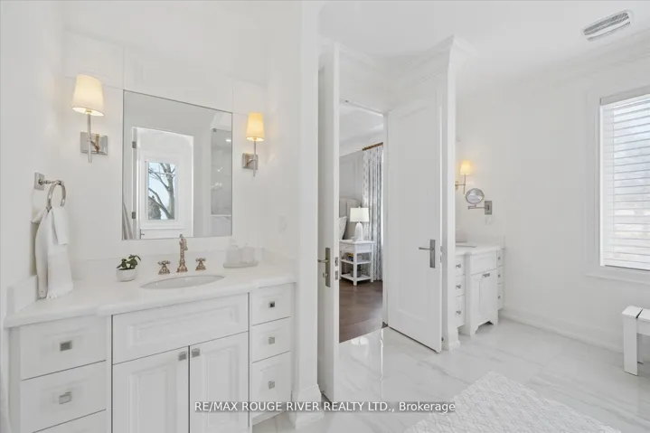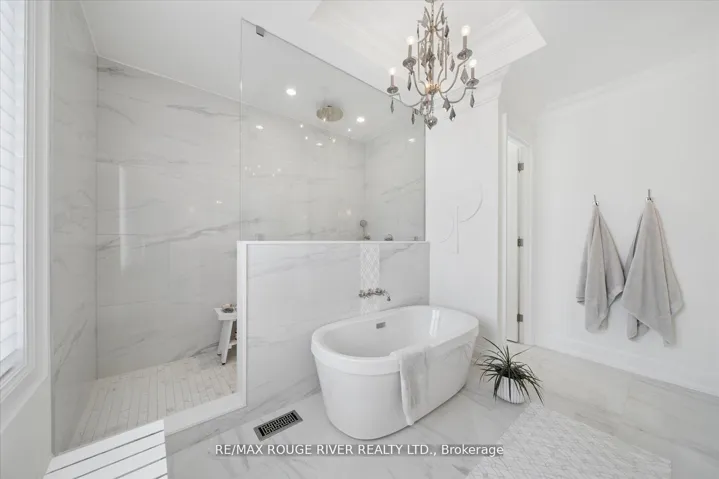 A Masterpiece of Modern Luxury in Pickering’s Coveted Bay Ridges by the Lake. Custom-built in 2019, this spectacular and grand Georgian -Style residence offers over 4,000 sq. ft. of total living space defined by top-of-the-line finishes and architectural scale. The journey begins at the grand 8-foot fiberglass front door, opening to a foyer inlaid with imported Italian marble mosaics and a soaring open-concept floor plan. With 10-foot ceilings on the main level and 9-foot on the second, the home feels incredibly bright and airy, anchored by 6-inch Canadian-made oak hardwood floors, and elegant coffered ceilings. The heart of the home is a chef’s dream kitchen, featuring a professional Thermador appliance package with panelled integration, Caesarstone countertops and an impressive butler’s pantry. The living room features a custom marble surround for the gas fireplace. Every detail has been curated for the discerning buyer, from the powder room’s marble vanity and Italian marble floors to the custom blinds and draperies crafted from imported Italian fabrics. The second level continues the theme of excellence with custom wainscotting and custom organizers in every bedroom closet. The primary retreat is a true sanctuary, boasting a spa-like ensuite with imported Italian tile, double Caesarstone vanities, freestanding soaker tub, and an oversized shower with drying area.The quality craftsmanship and luxury extend into the professionally finished 9-foot ceiling basement, featuring oversized windows that flood the full in-law/nanny suite with natural light. The exterior is equally impressive, showcasing custom precast stonework, a pool-sized backyard with an oversized interlock patio, a pergola, and a custom-built greenhouse. The garage features polyaspartic flooring, wall-to-wall storage, and an electric car charger. Nested on a quiet court steps from the lake, beach, parks and schools. This home is truly a rare find.