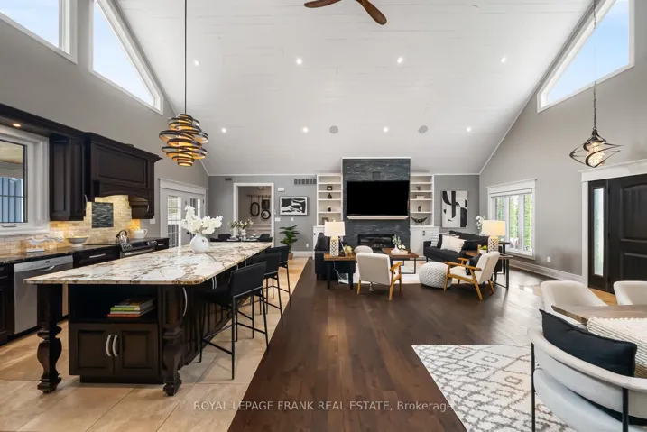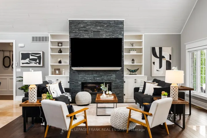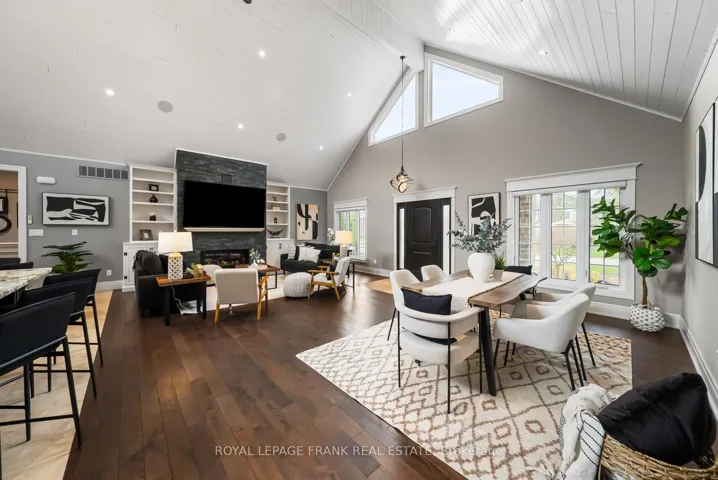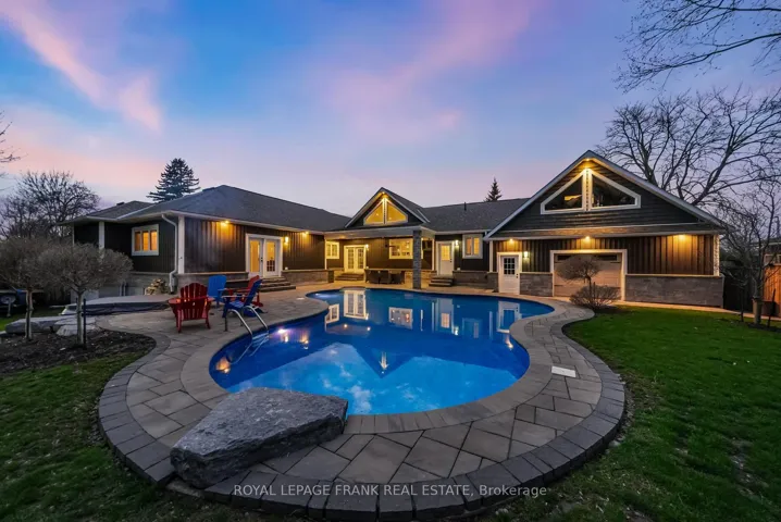 Welcome to an extraordinary, masterfully crafted bungalow offering over 5,300 square feet of impeccably refined living space. Set on an expansive 100′ x 150′ private estate lot, the residence is complemented by a resort-inspired backyard oasis, showcasing a lagoon-style heated saltwater pool and hot tub enveloped by professionally curated landscaping. A triple-wide, extended driveway accommodates up to 12 vehicles, in addition to a heated FOUR CAR GARAGE featuring a convenient drive-through bay. Inside, a breathtaking great room unfolds beneath soaring 20-foot cathedral ceilings, framed by dramatic gable-end windows that bathe the space in natural light. The main level is defined by 9-foot ceilings, exquisite hardwood flooring, and expansive four-foot-wide hallways enhanced with elegant wainscoting. At the heart of the home lies a chef’s kitchen of exceptional quality, appointed with fine solid wood cabinetry, soft-close detailing, and pristine quartz countertops anchored by a grand centre island. The primary suite serves as a serene private sanctuary, complete with dual walk-in closets and a spa-inspired ensuite featuring a granite walk-in shower, freestanding tub, heated floors, and a discreet, soundproof in-suite laundry. Three additional main-level bedrooms offer flexible accommodation for family and guests. The finished lower level extends the home’s luxurious living space, presenting two generously sized bedrooms, a dedicated fitness studio, and an expansive family room centered around a striking 100″ Napoleon fireplace. Above the garage, a spacious loft provides an ideal setting for a private office or creative studio. The professionally landscaped grounds, complete with a comprehensive irrigation system, ensures an effortlessly maintained outdoor environment. This exceptional estate is perfectly tailored for discerning homeowners who value both luxury, versatility and comfort.