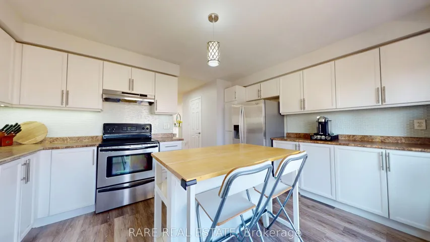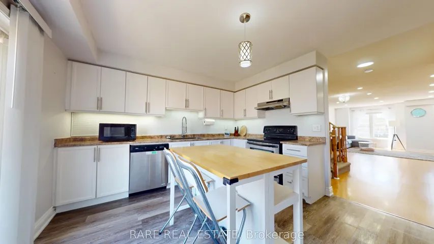 Welcome to 41 Cullcastle, a beautifully appointed freehold townhome nestled in one of Ajax’s most sought-after communities, offering a perfect blend of comfort and sophistication for modern living. This bright, elegant home features three spacious bedrooms and three well-appointed bathrooms, with an airy open-concept layout ideal for both everyday living and entertaining. The seamless flow between the living and dining areas is enhanced by abundant natural light, highlighted by added trim moulding and pot lights in the living room, creating a refined and inviting ambiance. The contemporary kitchen has been thoughtfully updated with white cabinetry, glass subway tile backsplash, a stainless steel single sink, and newer appliances including a refrigerator, dishwasher, and washer and dryer, while offering a walk-out to a private balcony, perfect for morning coffee or evening relaxation. A warm and inviting family room on the main level provides additional living space with direct garage access for added convenience. The primary bedroom serves as a true retreat with dual closets, a spa-inspired four-piece ensuite, and elegant crown moulding. Additional upgrades include updated vinyl flooring in the foyer, kitchen, and all bathrooms, refreshed vanity sinks and cabinetry, a newly updated staircase carpet, and a fully finished basement for added living space. Step outside to a beautifully added wooden deck in the backyard, perfect for entertaining. Freshly painted throughout, this move-in ready home offers a polished, upscale feel, ideally located just minutes from Highway 401, GO Transit, shopping, community amenities, and top-rated schools, delivering the perfect balance of luxury, lifestyle, and location.