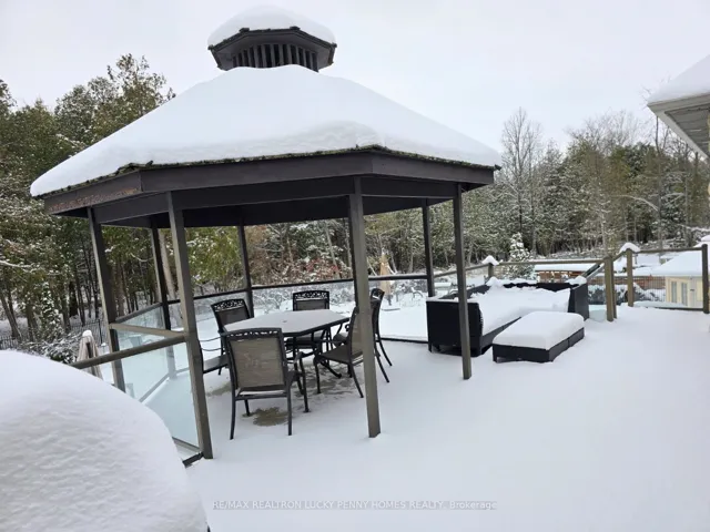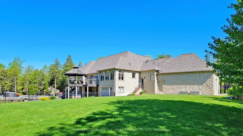 The Ultimate Entertainer’s Dream Home! This one-of-a-kind luxury bungalow offers approximately 3,200 sq ft per level of refined living space on a 2-acre private treed lot in a quiet cul-de-sac, backing onto a serene 20-acre parcel with a km walking trail loop.Step inside to discover a bright, open-concept main floor with 10-foot ceilings, elegant crown moulding, and hardwood and tile floors throughout. The family room features a gas fireplace, built-in shelving, and walkout to the deck, seamlessly connecting to a gourmet kitchen with stainless steel appliances, centre island, and tile flooring. Adjacent breakfast area also walks out to the deck, overlooking the resort-style backyard. The formal dining room offers a gas fireplace and bay window, perfect for gatherings.The primary bedroom suite includes a gas fireplace, walk-in closet, and walkout to the deck, while two additional main-floor bedrooms share a semi-ensuite and feature hardwood floors and large windows. A private office with crown moulding and large window provides a perfect workspace.The professionally finished walkout basement boasts heated floors, 10-foot ceilings, and a spacious Great Room with wet bar, gas fireplace, and walkout to the patio. Additional features include two more bedrooms, an exercise room, and ample storage space-ideal for guests or multi-generational living. Step outside to your backyard oasis featuring an in-ground pool, cabana, and multiple seating areas surrounded by mature trees, creating the ultimate resort experience. The backyard also includes a treehouse and a dog free run fenced area, offering both adventure and freedom for family and pets alike.