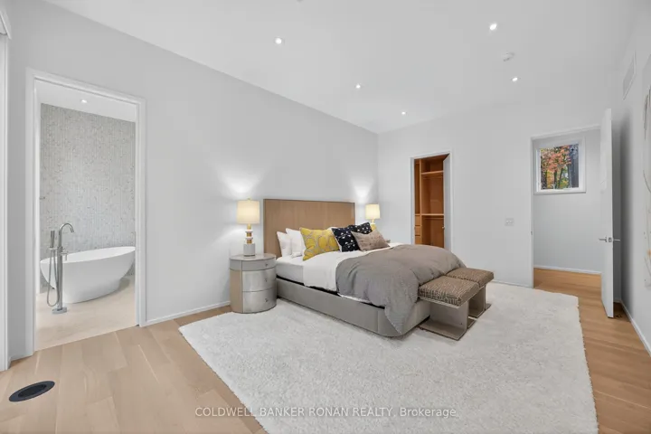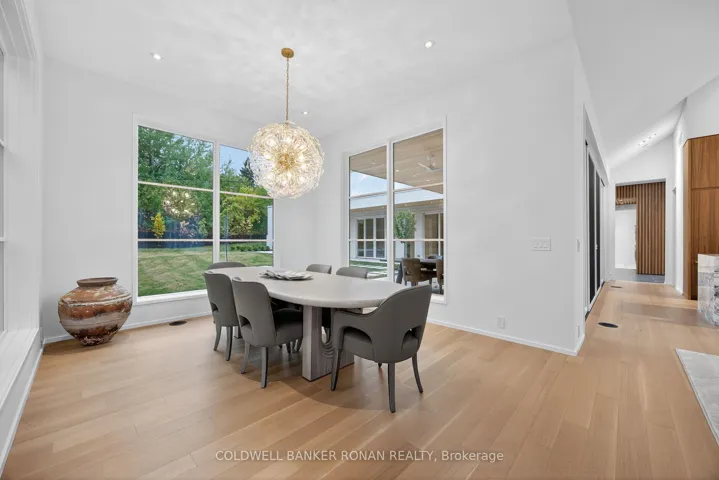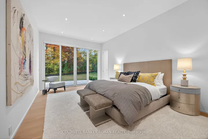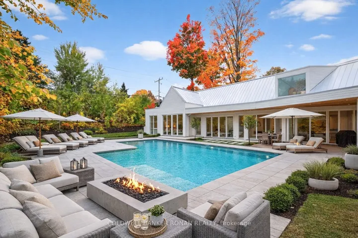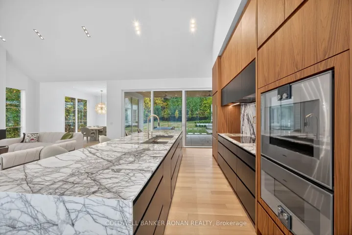 Luxury living in this breathtaking Forest View Home, crafted by Georgio Lolos Designs w/ interiors curated by ABella Design Inc. This stunning property is built with an eye for elegance & functionality. Step into the home through a custom wood slatted wall foyer. Six skylights flood the space with natural light. Open riser, Hollywood stairs w/ sleek glass railings lead to a private bedroom retreat over the garage. Specialty lighting highlights the grandeur of the 18-foot A-frame vaulted ceiling in the main living area, creating an inviting ambiance around the 50″ gas fireplace clad in black soapstone. The home showcases 6′ White Oak flooring throughout for a seamless & warm finish. The powder room impresses w/ a Starck wall-hung toilet, integrated marble sink & an exquisite book-matched Bianco Lasa marble wall. The heart of the home features a dream kitchen, equipped w/ walnut cabinetry, an impressive 14-foot waterfall island & a handcrafted 50′ Julien sink. Grey Lilac marble adorns the kitchen & pantry, complemented by full-slab backsplashes. Cooking is elevated w/ a 36′ Gaggenau induction cooktop, 30′ Gaggenau wall oven, fully integrated 36′ Thermidor fridge & Bosch dishwasher. The custom range hood & gold fixtures adds an elegant touch while a wine fridge in the pantry & a wall mounted pot filler over the stove round out the space’s luxury. The TV lounge features a built-in Gaggenau coffee maker & beverage fridge, elegantly integrated into custom cabinetry & a sophisticated walnut accent wall. Each bedroom offers an ensuite bathroom & custom closets. Primary ensuite is a private oasis w/ custom wall hung vanity, a luxurious Knief, K-Stone tub, a wall-mounted Ae T DOT 20 Italia toilet, an oversized shower towel warmer. Laundry room is carefully designed, with beautiful cabinetry, clothes drying area & a custom dog wash station. A must see property for those seeking a refined yet comfortable living experience.