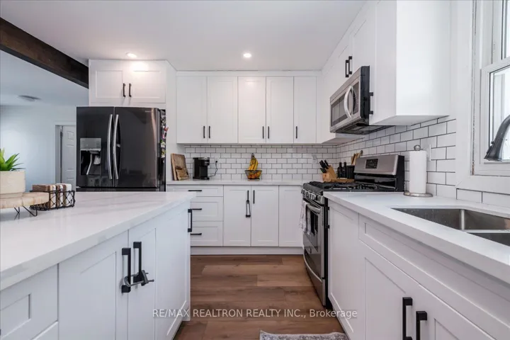 This charming bungalow sits on just over three-quarters of an acre at the edge of Angus and has been fully renovated with modern comfort and style in mind. Recent upgrades include a new heat pump, AC, and furnace installed in 2021 at a value of $20,000, as well as new siding, fascia, soffit, and eaves completed in 2025 and the roof is approximately eight years old. The home features new flooring throughout, a brand-new kitchen with quartz countertops and a subway-tile backsplash, and stainless-steel appliances including a propane stove. The open-concept main floor offers two spacious living areas filled with natural light, complemented by updated lighting, doors, and trim. The mostly finished basement provides additional living space with a dedicated man cave and a third bedroom. Outside, the property includes two sheds both with power, one with a newly installed roof, a gas barbeque line so you will never need to get propane. This beautifully updated home blends modern finishes with a generous lot, offering comfort, style, and room to grow.