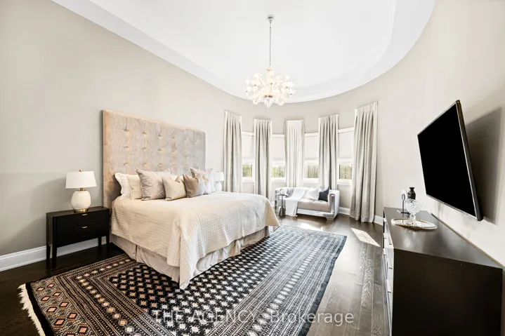 Located in the heart of King City, this beautiful bungaloft offers more than 6,900 square feet of finished living space in a community prized for its parks, trails, excellent schools, and quick access to the King City GO station. The home is introduced by a stone-and-stucco facade, a three-car garage, and landscaped grounds with a terrace and rear patio overlooking the ravine. Inside, soaring ceilings, hardwood floors, and detailed millwork set an elegant tone. The front foyer rises two storeys, leading to a series of principal rooms defined by coffered ceilings: a paneled office, a formal living and dining room, and a family room anchored by a gas fireplace. At the centre of the main level, the kitchen is fitted with dark-stained cabinetry, quartz counters, and a full suite of Wolf and Sub-Zero appliances. The adjoining breakfast area opens directly to the terrace. A main-floor primary suite with a spa-like ensuite and walk-in closet provides a private retreat, while a second bedroom with its own ensuite adds flexibility for family or guests. An elevator connects all three levels. The upper floor includes two additional bedrooms, a full bath, and a den well suited for children, extended family, or a separate study. The fully finished lower level is above grade, with oversized windows and French doors leading to the rear patio. This home includes total of 4 + 2 bed and 4 + 2 bath. Designed as a complete secondary living area, it includes a full kitchen with quartz counters and Samsung appliances, a dining area, a large recreation room with fireplaces, two bedrooms, and additional baths. This thoughtful layout makes the property especially accommodating for multi-generational living. Every detail of this residence reflects quality and enduring design, offering a rare opportunity in one of King City’s most desirable settings.