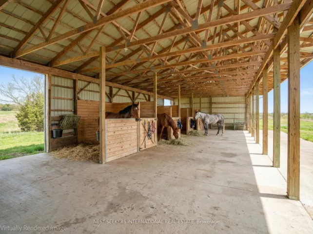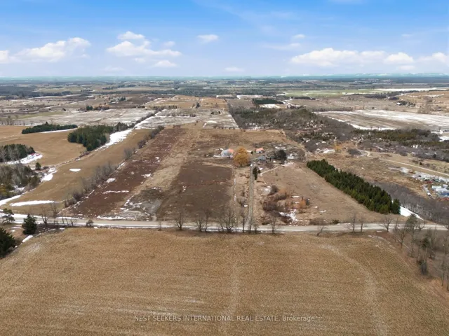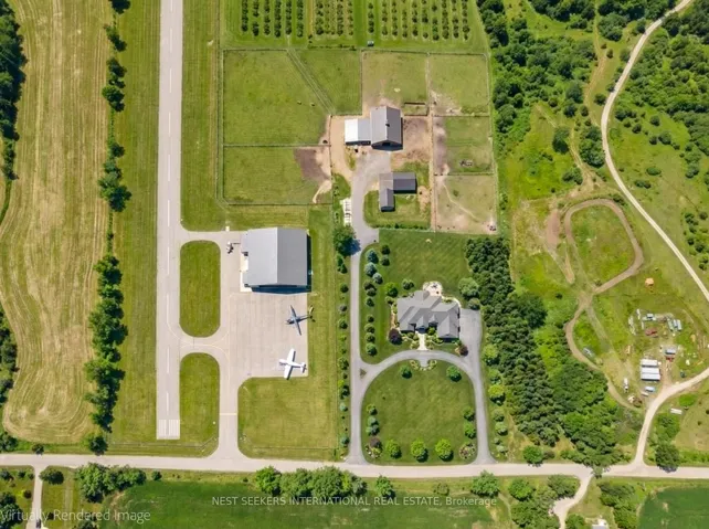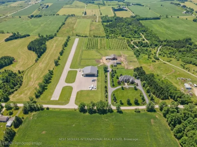 Welcome to this unique 47-acre parcel in South Essa Township, zoned for private aircraft aerodrome use, offering a rare combination of agricultural, commercial, and residential zoning. The property includes approximately 5 acres of commercially zoned land fronting on 8th Line, providing excellent exposure and accessibility for a variety of permitted uses. This expansive property features a traditional Ontario farmhouse with six bedrooms, offering strong potential for multi-tenant use or rental income, along with excellent future redevelopment opportunities. The property is improved with multiple functional outbuildings, including a studio space, as well as a substantial 50′ x 80′ aircraft hangar with an 18′ x 40′ office area. A registered aerodrome, the property includes a functional airstrip along with additional shorter runways, making it ideally suited for aviation-related use or businesses requiring private air access. With its flexible zoning and established infrastructure, the property supports a wide range of uses, including agricultural operations, home-based businesses, and specialized commercial applications (subject to municipal approvals). The scale, privacy, commercial frontage, and strategic location create a compelling opportunity for investors, end-users, or those seeking a live/work environment with long-term upside.