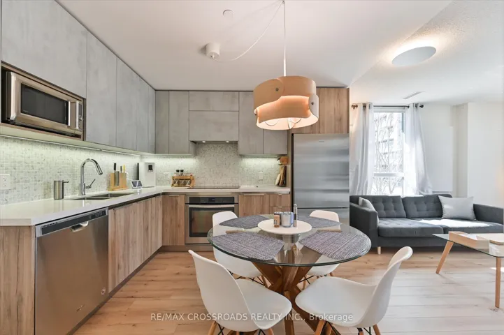 Rare Corner Sanctuary in Riverside Uptown Markham – Sunset Views & Ultimate Privacy. True pride of ownership! Experience the pinnacle of urban living in this meticulously maintained oversized 1-bedroom plus den corner suite. Spanning 695 square feet of meticulously upgraded space, this southwest-facing unit is flooded with natural light and offers a rare level of tranquility – tucked away at the end of the hallway with no neighbours above! The versatile, sun-filled den features a large window and is easily convertible into a functional second bedroom or executive home office. The gourmet kitchen is a chef’s dream, featuring an upgraded GE Cafe induction cooktop, premium stainless steel appliances, and sleek cabinetry. The open-concept living area is anchored by a custom built-in media wall unit and accented by upgraded designer light fixtures throughout. Upgraded with CAT6 network wiring throughout for seamless, high-speed internet connectivity in every room. Not to mention, already included in the maintenance fee is Rogers 1.5 gigabit internet for your convenience! Includes 1 Parking & 1 Locker. Enjoy world-class LEED Gold amenities: an infinity rooftop pool, fitness centre, library/Wi-Fi lounge, and 24-hour concierge. Located steps from Whole Foods, luxury dining, and Viva Transit, with rapid access to Highways 407 and 404.