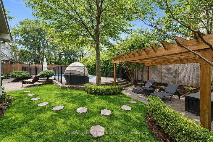 Nestled on the prestigious and highly sought after Riverside Blvd in Thornhill, this charming 4+1 bedroom home offers a private backyard retreat complete with a salt water pool, cabana, and stunning perennial gardens. The Uplands neighbourhood is known for large estate lots and executive homes. This exclusive enclave attracts discerning homeowners seeking luxury living in a serene and distinguished setting. Uplands Golf and Ski club at your doorstep! Spacious principal rooms, hardwood throughout, crown mouldings, 2 wood burning fireplaces, office space on the main floor and more! Tastefully updated kitchen with custom cream cabinetry, crown moulding, neutral tones, premium stainless steel appliances, Subzero fridge, breakfast bar and a vaulted sun room with seating for casual dining. The sunny breakfast room is surrounded by windows that overlook the backyard oasis with the colourful garden and salt water pool. Well designed with excellent flow for entertaining and busy family living. Oversized lot with lush greenery and mature trees.