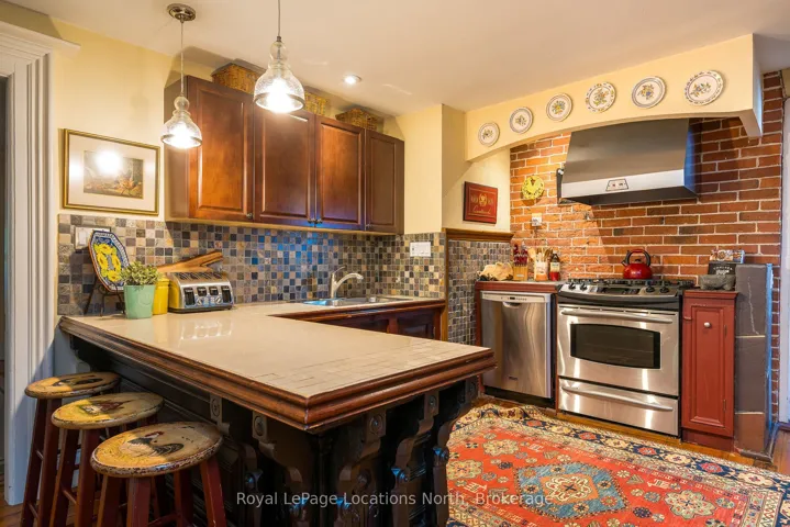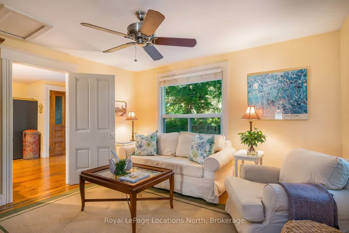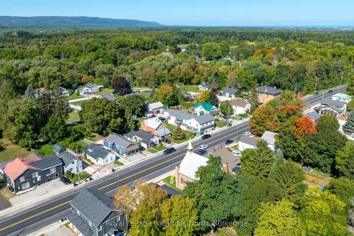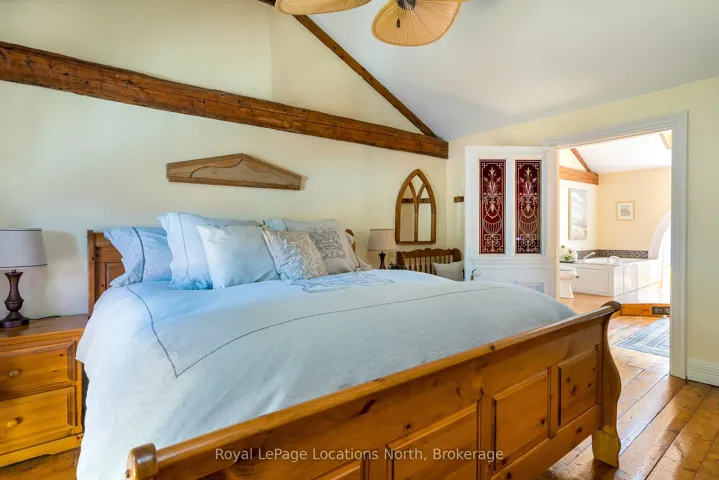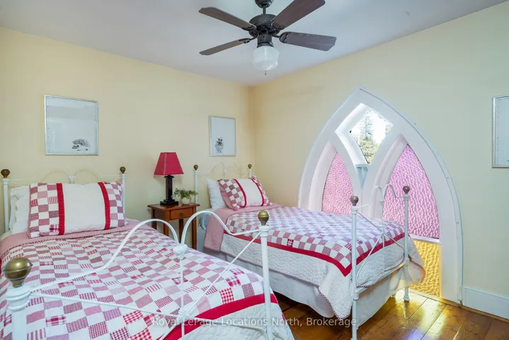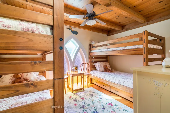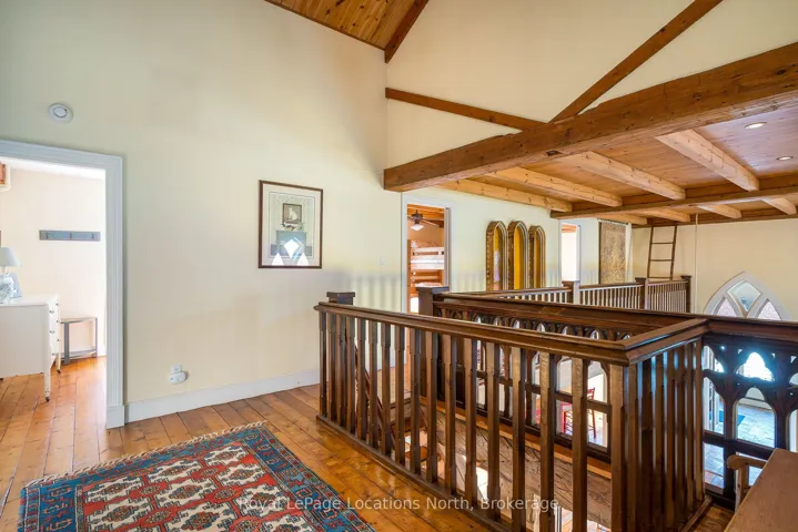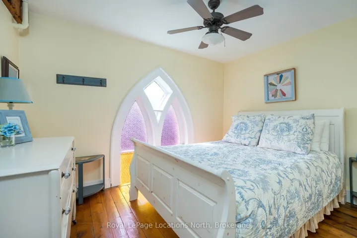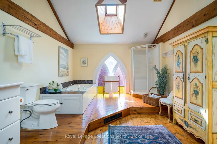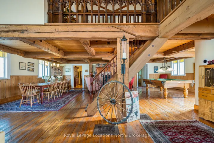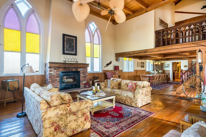 When you step inside this unique, renovated 1897 church, you can’t help but imagine the fabulous holidays your family and friends would enjoy here. On the main street of the charming village of Nottawa, this is a home meant for gathering. This rare opportunity is absolutely full of thoughtful touches and decor lavished on it by its current owners, and all those touches are included in the sale. Furnishings, linens, rugs, art, lamps, antiques, even the dishes, all come with the house so moving in will be easy. Your family will enjoy the restful and restorative atmosphere of the main floor with the soft light of stained glass. The sprawling living space under post and beam cathedral ceilings has a chalet like feel. It features a primary seating area in front of a wood burning fireplace with a wonderful long and welcoming bar for entertaining. The bar itself was recovered from an old general store. An adjoining space houses another seating area in front of a gas fireplace and a large billiards table. The dining table seats 14 so no card tables will be necessary. Each space is wide open yet beautifully defined with a combination of historic details and new improvements. You will have room for all your guests in the five upstairs bedrooms, all stylishly decorated and all enjoying the comforting glow of stained glass windows.The main floor den has a pull out sofa bed and an ensuite bathroom for additional sleeping quarters. It is a home to wander in, explore, and bask in its warmth and coziness. Outside, a large backyard deck allows space for an oversized bbq and an enormous hot tub, all under a beautiful canopy of mature trees. Multiple sheds for storage and potting make maintenance easy — and even the garden equipment is included.