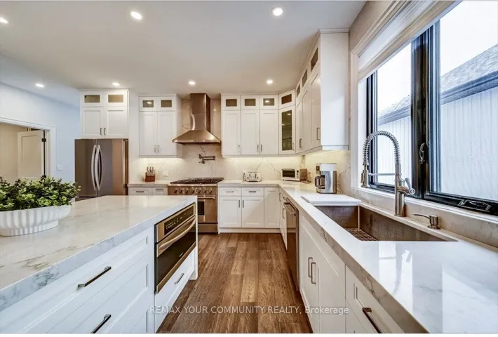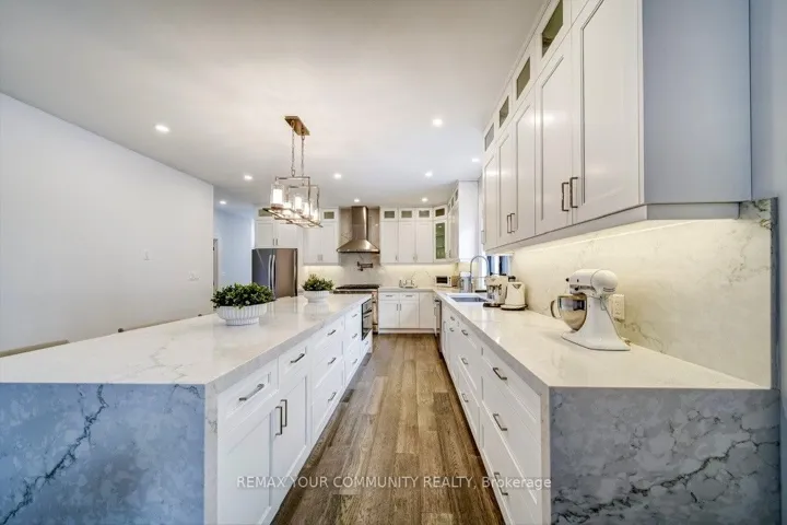 Step into this exceptional detached raised bungalow, where modern luxury meets effortless everyday living. Offering over 3,300 sq. ft. of beautifully finished space, this home is crafted to impress from top to bottom. The main floor features three generously sized bedrooms and two spa-inspired 3-piece bathrooms, each adorned with elegant porcelain tile. The heart of the home is the open-concept kitchen and dining area, showcasing custom quartz countertops, a striking waterfall island, and premium stainless steel appliances-perfect for both cooking and entertaining. Bright and inviting, the living room is enhanced by a soaring cathedral ceiling and opens onto a large covered composite deck with modern glass railings, creating an ideal indoor-outdoor retreat. A thoughtfully designed main-floor laundry room with a built-in pantry adds convenience without compromising style. The fully finished lower level provides outstanding extra living space, complete with three spacious bedrooms with above-grade windows, a chic 3-piece bathroom, and a large kitchenette featuring custom quartz counters. The expansive dining and family area is perfect for hosting gatherings or creating a private suite for extended family. Move-in ready and loaded with high-end finishes and carefully selected upgrades, this home is a rare find that truly must be seen to be appreciated.