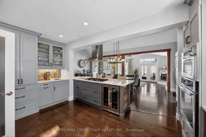 What a treat! Delightful home, meticulously cared for. Custom Designed Kitchen with top quality Cambria Counters. Jennair Gas Range, built in double oven and terrific breakfast bar (Ideal for guests while entertaining & chef duties are happening)… that makes me think of the handy wine fridge.! Spacious dining area, suitable for large table & vaulted ceiling adds drama… flowing beautifully to the sunken living room, with built-in cabinets and cozy gas fireplace. All of this with gorgeous view of the sparkling sun on the water. (Isn’t that what lakefront living is all about?) Main floor Primary Bedroom offers convenient privacy and another amazing view of the lake…along with a walkout to the deck and waterfront. The Primary Ensuite is awesome, heated floors, stand-alone tub, glass shower…just so nice! Then the large walk-in closet is perfectly positioned and well suited to handle your wardrobe. The main floor laundry and garage entrance make for handy access and convenience. Walk up the hardwood stairs, across the loft view over the great living areas and find a private bedroom area, with it’s own 4pc ensuite (heated floors, no less). The waterfront is easy access, gently sloping with a terrific dock system (composite surface) approx 60ft long. Now, you can’t miss the gracious size and high ceiling in the amazing sun room (very adjustable windows & screens) which can extend your enjoyment so much of the year. The Vieto Radiant heaters and custom blinds ensure you have all the comfort options you can imagine. All year long you can surely relax in the Jacuzzi Hot Tub, and there are 2 separate gas line hook-ups for BBQ etc. Worry free is a good thing, hence the full home Generac Generator is standing by at your service to ensure no interruptions…even during that dinner party, or waterfront gathering. Nice!