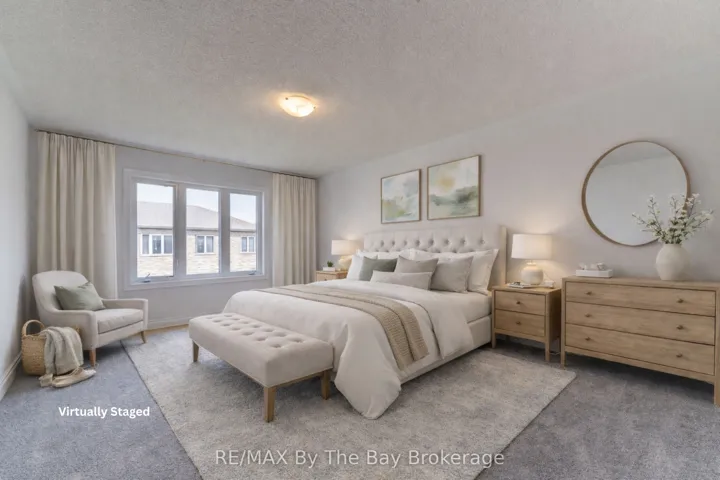 Move-in-ready, never-lived-in end-unit freehold townhome by Baycliffe Communities in the highly sought-after Wasaga Sands community. This Coral model offers 1,876 sq ft of well-appointed living space with a functional, modern layout. The main floor features a versatile front room suitable for dining, a home office, or sitting area, an open-concept living space with hardwood flooring, and a kitchen with extended cabinetry, island with double sink, black countertops, and breakfast area. 9-foot ceilings on the main level enhance light and openness. Upstairs includes a spacious primary bedroom with walk-in closet and 5-piece ensuite featuring a freestanding soaker tub and double vanity, two additional bedrooms, a full bath, and convenient second-floor laundry. The unfinished basement includes a bathroom rough-in, offering excellent future flexibility. Ideally located minutes from schools, trails, shopping, and the world’s longest freshwater beach, with easy access to Collingwood and Blue Mountain. Tarion warranty included.