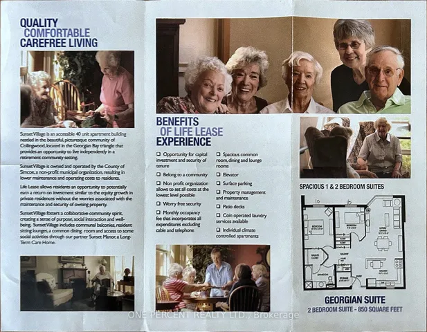 Welcome to Unit #110 at Sunset Suites. This rarely available and highly desirable ground level suite, allows you the option to walk straight out your locking sliding door to the parking area. With this Life Lease, Property taxes are included in the monthly fee of $885.24, also included in this fee are heat, hydro, water and maintenance, parking and several storage areas, perfect for worry free, comfortable, safe and secure retirement living. Sunset Suites, a Life lease, 60+ senior building is Owned and operated by the County of Simcoe and offers a secured foyer with controlled access, private mailbox, gathering areas, common balconies on each floor, a multi-purpose room and many social functions with an Activity Coordinator onsite. This bright and roomy (2) bedroom unit boasts updated flooring, newer appliances and open concept living, plenty of storage and in suite laundry. The primary bedroom with walk-in closet also features direct access to the large bathroom with walk-in shower. The second bedroom is perfect for guests, an office or an arts room. The building is well maintained by the County of Simcoe and perfectly located, just a short walk to the waterfront and trails. Come and enjoy everything Collingwood has to offer.