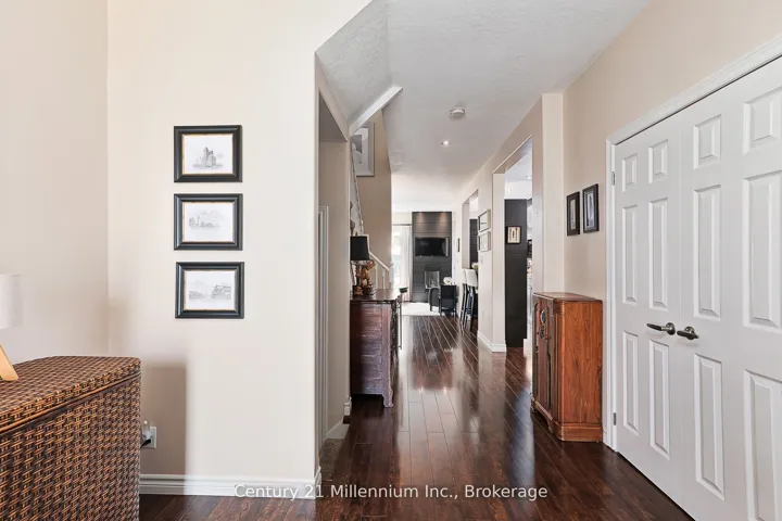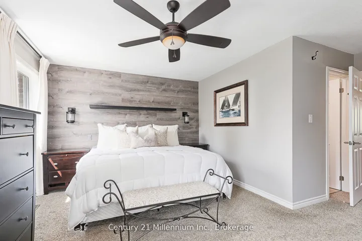 NO CONDO FEES / DOUBLE CAR GARAGE / BACKING ONTO GOLF COURSE / MINUTES TO BLUE / 2,075 SQ FT OF LIVING SPACE Discover an exceptional opportunity in Collingwood’s highly sought-after Mair Mills community: a beautifully renovated freehold townhome with no condo fees! This property blends modern comfort with a prime location, boasting sunny southern exposure and directly backing onto the serene 6th hole of the Blue Mountain Golf Course. Step inside to a thoughtfully updated interior featuring an open-concept kitchen and living room with a cozy fireplace. Patio doors lead to a professionally landscaped yard, creating a seamless indoor-outdoor flow perfect for entertaining. Significant recent upgrades include a new hot water heater (2021), A/C unit (2022), and new front/back doors (2022).Upstairs, the large primary bedroom provides a private retreat with a walk-in closet and en-suite. The level also features a unique guest suite with a den, created by combining two original bedrooms. This versatile space is ideal for a home office or creative studio and is steps away from the recently renovated main bath (2024).The fully finished basement offers a cozy rec room with an electric fireplace, ample storage, a rough-in for a bathroom, and a laundry room equipped with a convenient dog wash station. Outside, your private oasis awaits. Enjoy the sheltered 20′ x 14′ patio, accessible from the dining area or garage. The backyard features beautiful landscaping (2021), a spacious deck, a hot tub, and two storage sheds. The oversized, attached double-car garage is a standout feature, boasting 10-foot ceilings and a fully insulated, heated interior. Mair Mills is a vibrant, family-friendly community offering a children’s park and tennis courts, all just minutes from Blue Mountain Village.