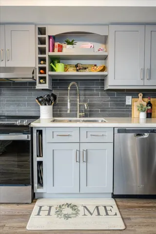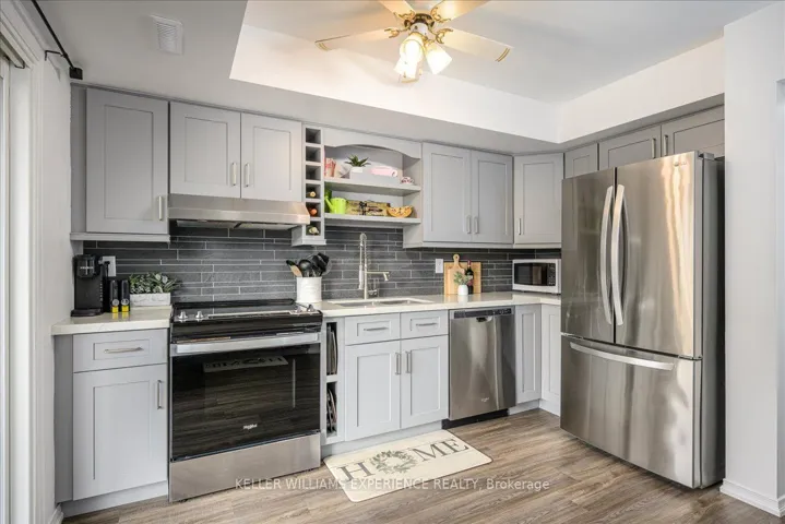 Sun-filled and beautifully updated, this 3-bedroom, 2-bath stacked condo townhome offers stylish, low-maintenance living in a quiet, convenient neighbourhood close to shopping, schools, the GO Train, commuter routes, and the lake. Renovated in 2022 by the current owner, the home features a stunning updated kitchen with quartz countertops and gray shaker cabinets, an undermount double stainless sink, backsplash, stainless steel appliances, and new laminate, vinyl, and broadloom flooring throughout. Both bathrooms have been fully renovated, and the interior has been painted in neutral tones, creating a bright, warm, and modern feel. Large windows bring in abundant natural light from all directions, while each bedroom offers a full-size closet and generous window space. Additional features include in-suite laundry, a gas furnace (2022), central air conditioning (2023), newer vinyl double-hung tilt windows, a new front door with screen door, a spacious deck, dedicated parking, and clear pride of ownership throughout. Spacious and suitable for all ages, this well-maintained property also offers very affordable condo fees ($383.00) that cover all the exterior maintenance and common areas, making for easy, worry-free living.