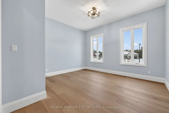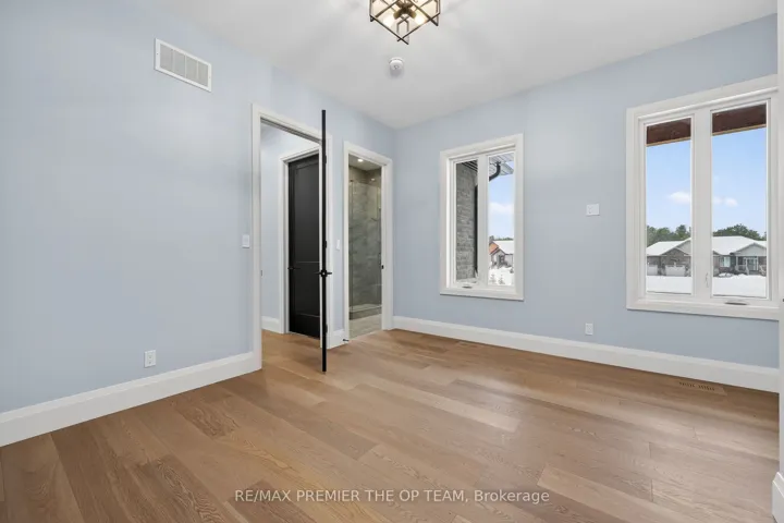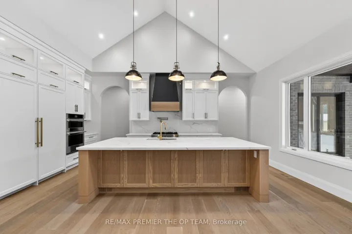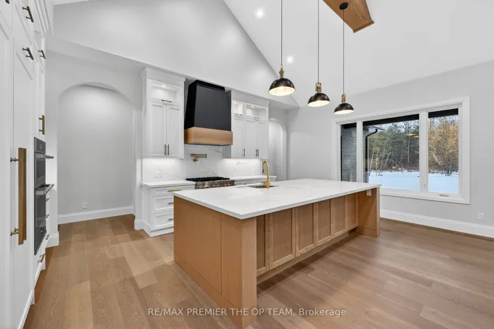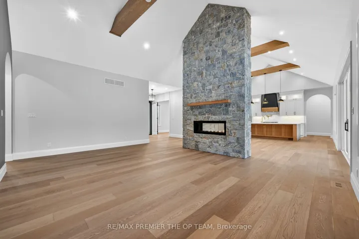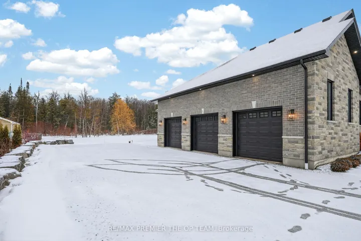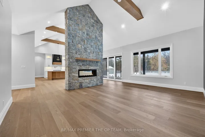 New 3,200 sq. ft. custom stone and brick bungalow on over an acre, built by a quality builder and backed by Tarion warranty. This stunning home features wide plank hardwood floors, high-end light fixtures, Jenn Air appliances, and Riobel bathroom fixtures throughout. The open-concept kitchen and living area is highlighted by a massive island, butler’s pantry with espresso bar, and a dramatic floor-to-ceiling double-sided stone fireplace, with walkout to a covered back deck overlooking a pool-sized yard and forest backdrop. The principal suite offers a feature wall, walk-through custom closet, and spa-inspired ensuite. Separate bedroom wing with 3 bedrooms and 2 full baths. Main floor laundry and mudroom off the impressive 40′ x 30′ garage with oversized doors, high ceilings for car lifts, and basement walk-up. Basement features 9 ft ceilings and rough-in for additional bath. Landscaping package includes exposed stone concrete walkway, entrance garden with two trees, sodded front yard, and hydro-seeded backyard. Excellent commuter location with easy access to Barrie and Hwy 400.