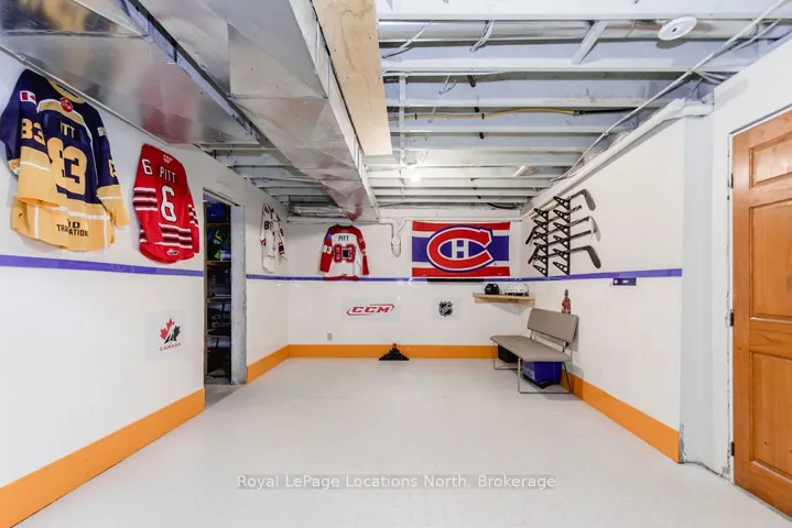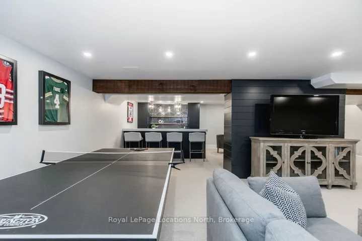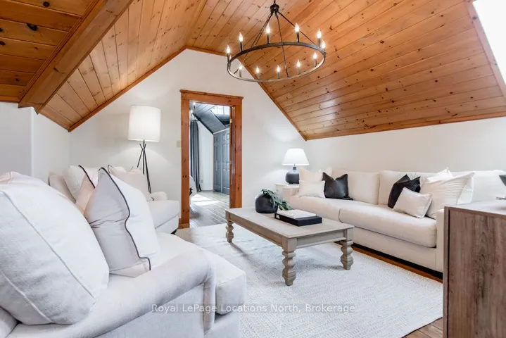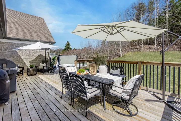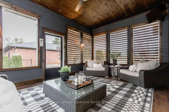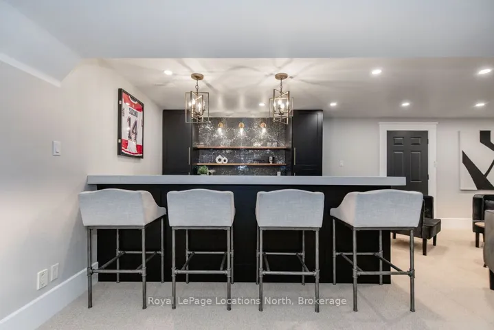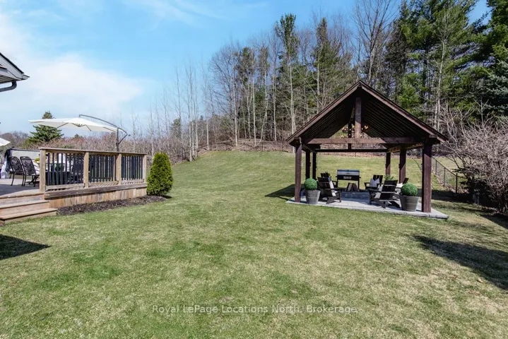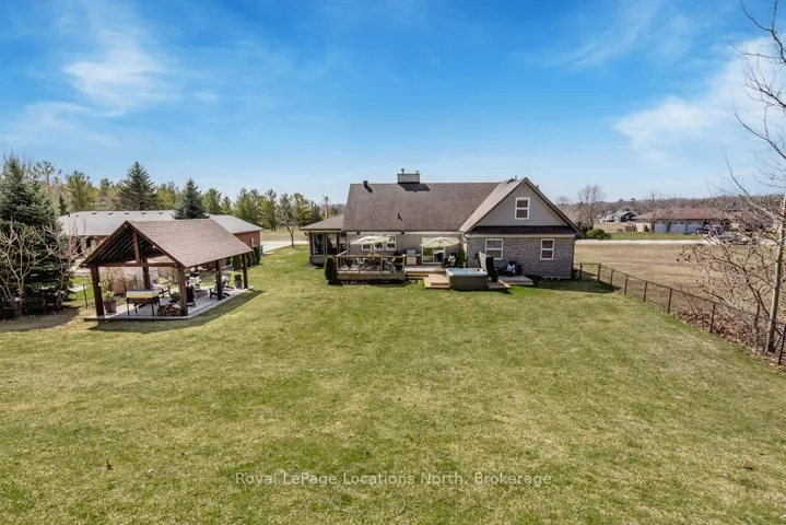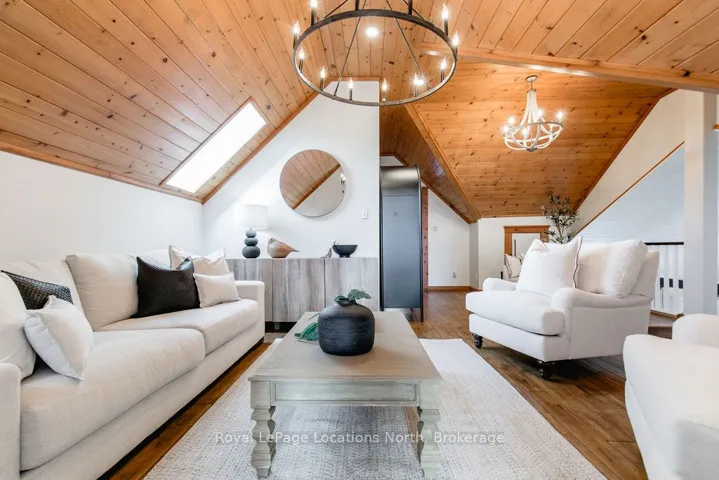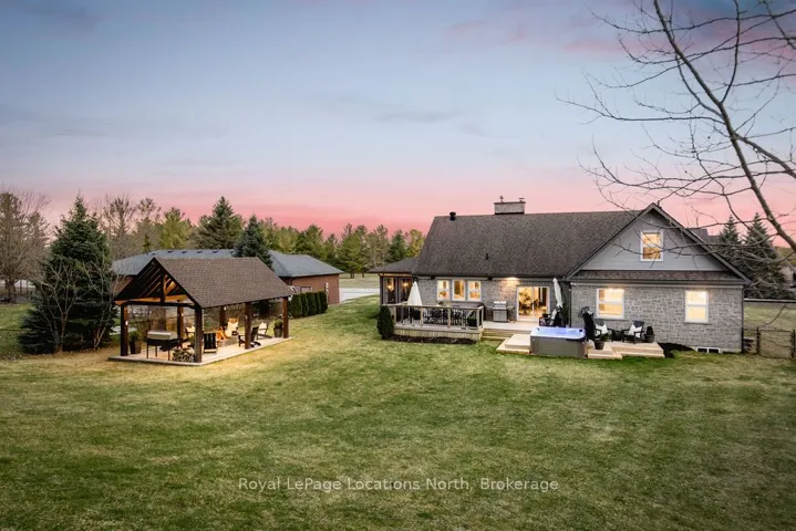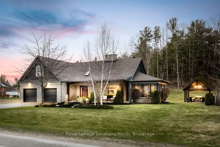 Set on a large, mature estate lot backing onto trees in the popular Wasaga Sands estate area, this custom-built modern rustic home offers privacy and warmth. Summer evenings invite you into the backyard where the timber-frame gazebo glows under custom lighting, the fire pit crackles and the treed backdrop creates a peaceful, resort-like setting. In winter, the snow-covered trees provide a serene view, perfect for unwinding by the fireplace after a day of skiing or snowshoeing. Inside, the home showcases vaulted ceilings with classic chandeliers, rich hardwood flooring throughout, and a stunning floor-to-ceiling stone fireplace that is the center piece to the open-concept family room and kitchen. The custom kitchen is ideal for entertaining, featuring a bright white palette, quartz countertops, custom backsplash and a spacious 9-foot island. Steps from the kitchen is a beautifully finished 3-season room, offering a comfortable retreat to enjoy the outdoors. Wide hallways lead to a built-in office nook and main-floor laundry. The primary bedroom is on the main floor, offering a retreat with a walk-in closet and a spa-inspired ensuite. Highlights include a floating soaker tub under a chandelier, a black-framed glass walk-in shower and quartz countertops. A second main-floor 4PC bathroom features a multi-head steam shower for a spa experience. Upstairs, the timber-frame loft creates a cozy second living area, complemented by two bedrooms with vaulted ceilings and an additional 4PC bathroom. The lower level features a custom dry bar, space for movies, ping pong, and poker nights. Sports lovers will appreciate the dedicated hockey shooting room, or turn it into a fitness room that supports an active lifestyle. Additional unfinished space offers future potential for two more bedrooms, a wine cellar. Outside, the deck provides room for outdoor dining and leads to a private hot tub. Double-car garage, fully drywalled and insulated with inside entry, plus parking for 4-6.