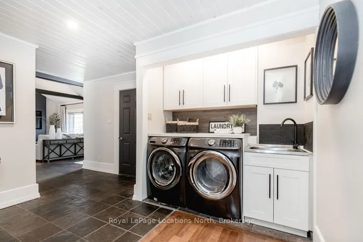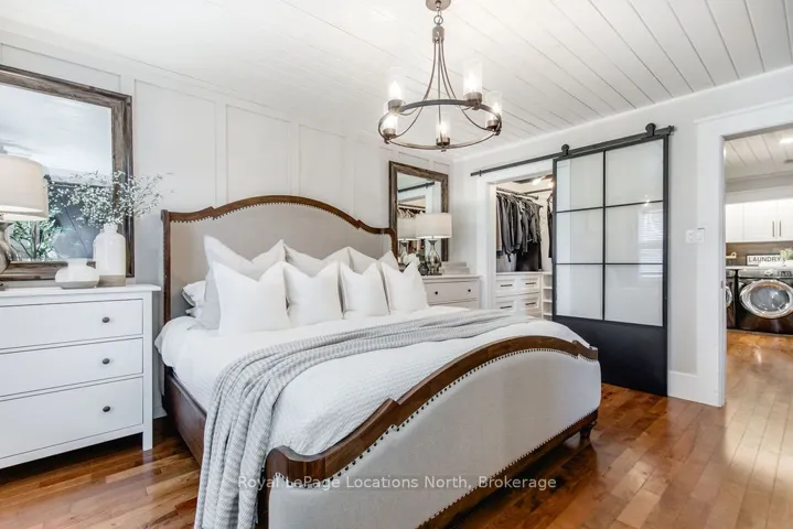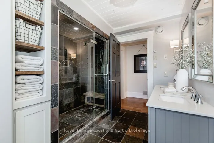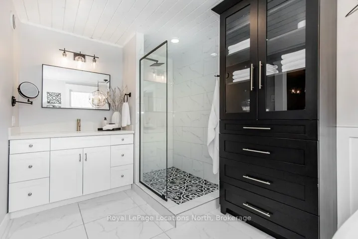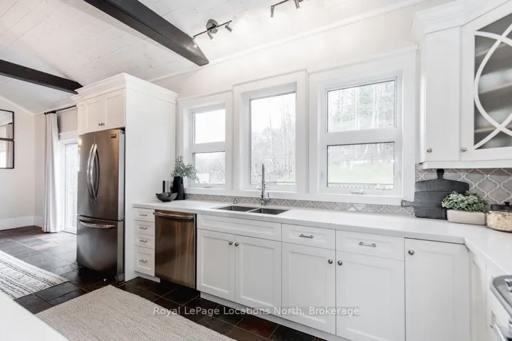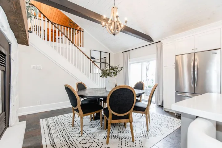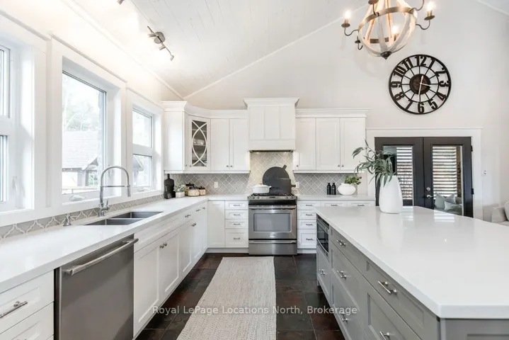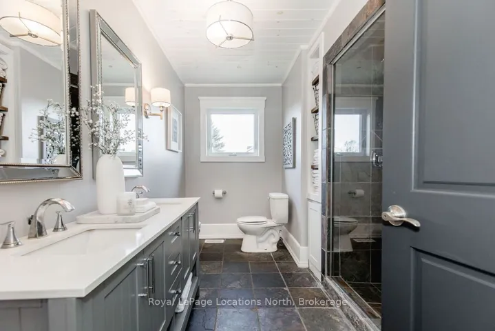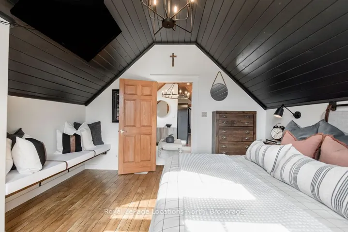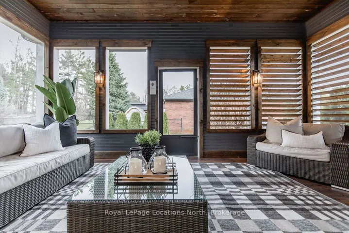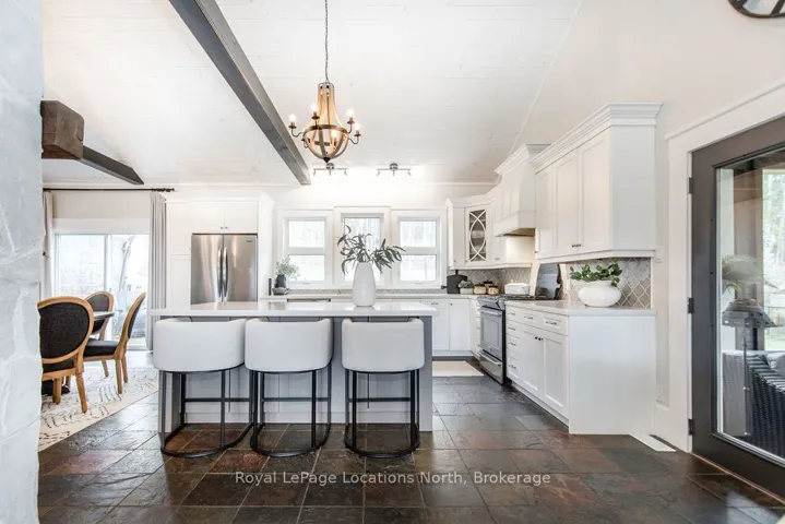 Set on a large, mature estate lot backing onto trees in the popular Wasaga Sands estate area, this custom-built modern rustic home offers privacy and warmth. Summer evenings invite you into the backyard where the timber-frame gazebo glows under custom lighting, the fire pit crackles and the treed backdrop creates a peaceful, resort-like setting. In winter, the snow-covered trees provide a serene view, perfect for unwinding by the fireplace after a day of skiing or snowshoeing. Inside, the home showcases vaulted ceilings with classic chandeliers, rich hardwood flooring throughout, and a stunning floor-to-ceiling stone fireplace that is the center piece to the open-concept family room and kitchen. The custom kitchen is ideal for entertaining, featuring a bright white palette, quartz countertops, custom backsplash and a spacious 9-foot island. Steps from the kitchen is a beautifully finished 3-season room, offering a comfortable retreat to enjoy the outdoors. Wide hallways lead to a built-in office nook and main-floor laundry. The primary bedroom is on the main floor, offering a retreat with a walk-in closet and a spa-inspired ensuite. Highlights include a floating soaker tub under a chandelier, a black-framed glass walk-in shower and quartz countertops. A second main-floor 4PC bathroom features a multi-head steam shower for a spa experience. Upstairs, the timber-frame loft creates a cozy second living area, complemented by two bedrooms with vaulted ceilings and an additional 4PC bathroom. The lower level features a custom dry bar, space for movies, ping pong, and poker nights. Sports lovers will appreciate the dedicated hockey shooting room, or turn it into a fitness room that supports an active lifestyle. Additional unfinished space offers future potential for two more bedrooms, a wine cellar. Outside, the deck provides room for outdoor dining and leads to a private hot tub. Double-car garage, fully drywalled and insulated with inside entry, plus parking for 4-6.