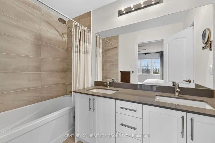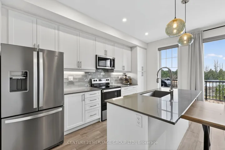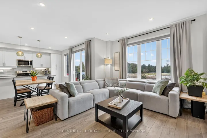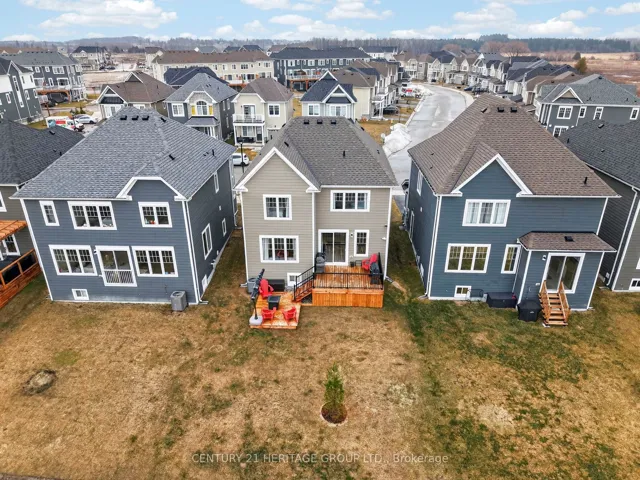 Welcome to 31 Abby Drive in Wasaga Beach-an exceptional 2023-built home backing onto the fairways and pond of Georgian Sands Golf Course. Offering 3 bedrooms, 2.5 bathrooms and approximately 1,763 sq ft, this upgraded two-storey home combines modern design with peaceful west-facing views. The open-concept main floor features 9′ ceilings and a bright, functional layout. The kitchen is beautifully finished with quartz countertops, undermount sink, custom tile backsplash, under-cabinet lighting, pantry, island with bar seating, and Whirlpool appliances. Walk out from the dining area to a brand new (2025) two-tier deck with natural gas BBQ hookup-perfect for entertaining or relaxing while overlooking the golf course and water. The living room offers stunning sunset views and a custom feature wall with gas fireplace, built-in shelving, and cabinetry. Upstairs, you’ll find three spacious bedrooms, a full main bath, convenient laundry room, and a well-appointed primary suite with walk-in closet and private ensuite featuring double sinks, quartz counters, and a separate water closet. All bedrooms include vinyl flooring, ceiling fans, and large windows. Custom blinds and curtains are installed throughout, and the home is equipped with Bell Fiber internet. The unfinished basement offers excellent potential with large above-grade windows, bathroom rough-in, sump pump with backup power, HRV system, water softener with chlorine treatment, and 200 amp service. Additional features include a 1.5 car garage with inside entry and side door, paved driveway with parking for two, and durable exterior finishes including engineered hardboard siding and manufactured stone veneer. Monthly common element fee approx. $325. Balance of Tarion warranty included. A move-in ready home in a beautiful setting-ideal for golfers, nature lovers, or anyone seeking a newer home with premium upgrades and scenic views.