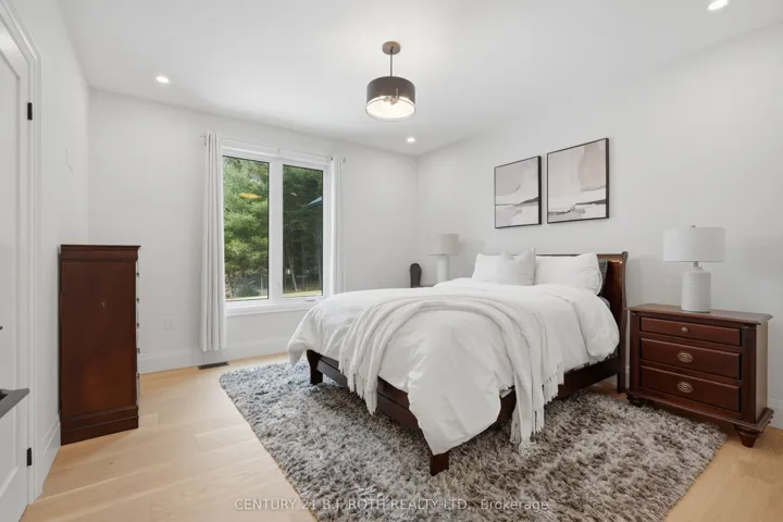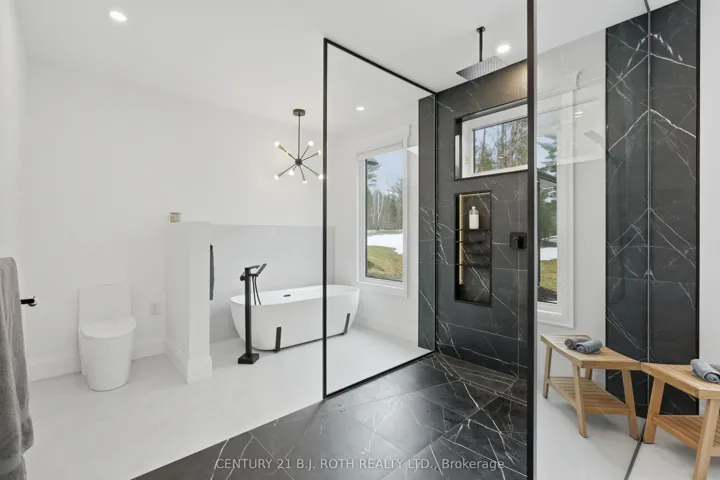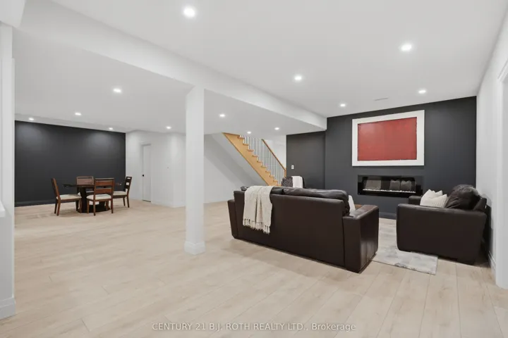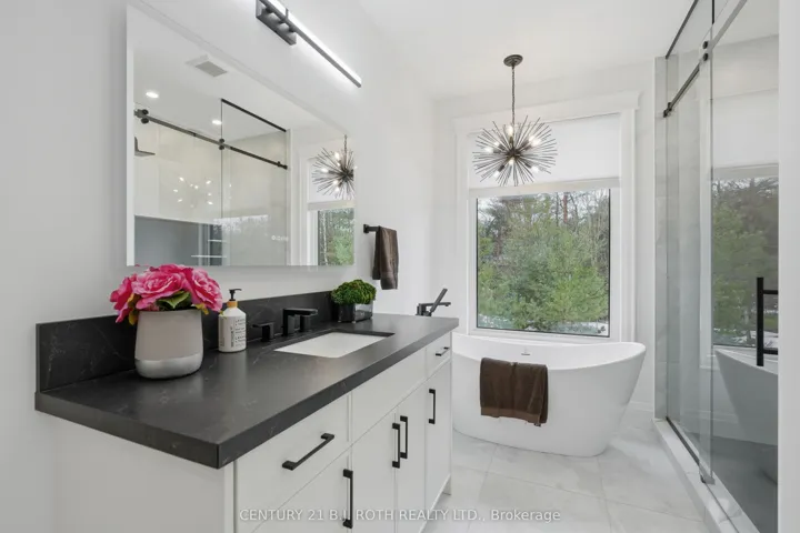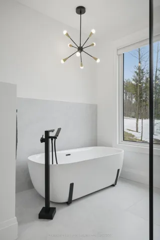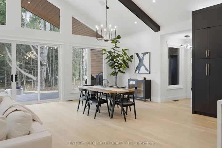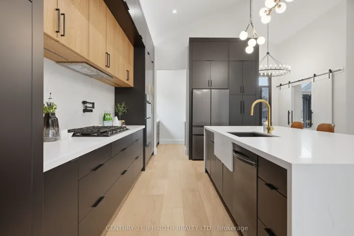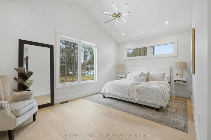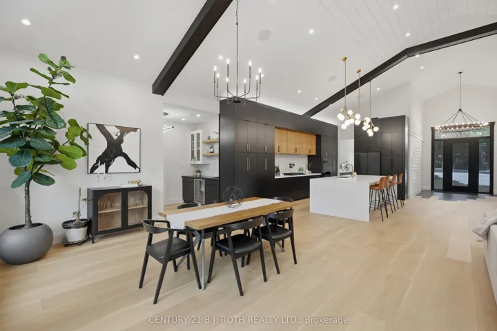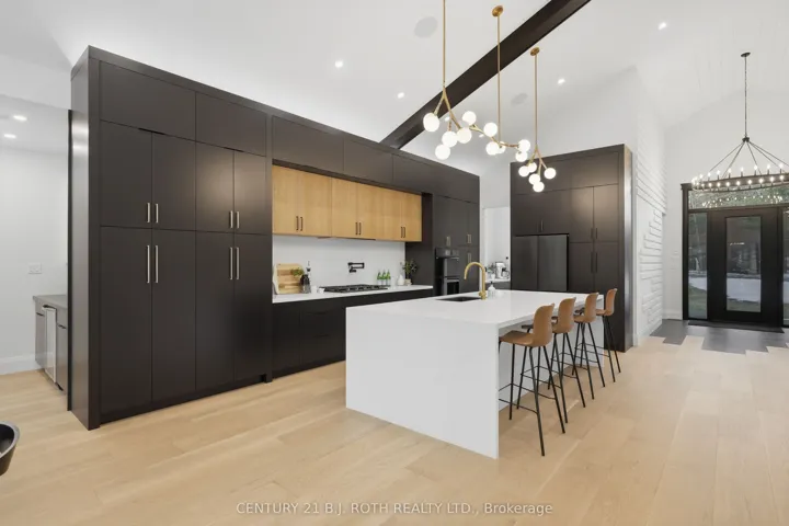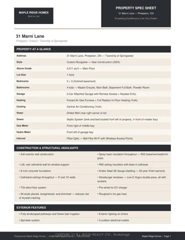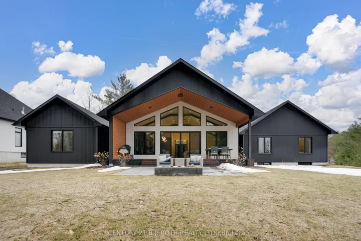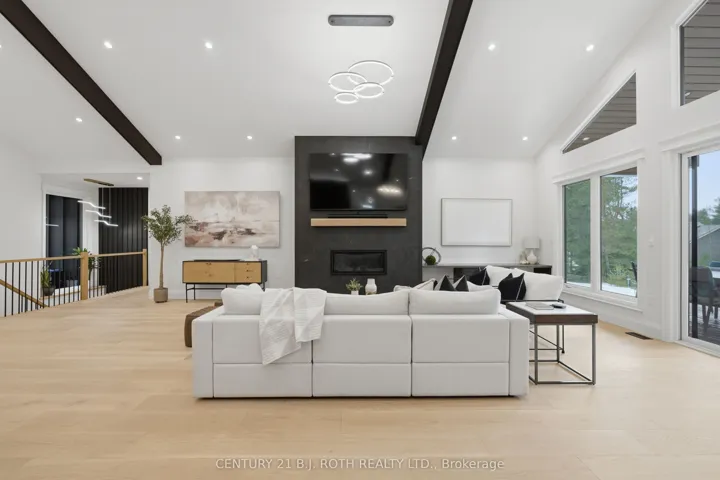 Welcome to 31 Marni Lane, an architectural statement set on a stunning 150.92′ x 268.93′ lot. Showcasing Scandinavian-inspired design, this home offers over 3,000 sq. ft. of main floor living space, plus a fully finished basement. A grand front entrance opens to soaring vaulted ceilings and expansive rear windows that immediately capture your attention. Wide-plank European white oak flooring flows seamlessly throughout the main floor, complemented by radiant in-floor heating and a fully integrated Sonos surround sound system that extends throughout the entire home. The kitchen is a true culinary showpiece, featuring quartz countertops with waterfall edges and wireless charging, sleek contemporary cabinetry, smart Wi Fi appliances, and a chef’s pantry with additional quartz workspace. A stylish wet bar complements the space, perfect for entertaining. And with entertaining in mind, the main area offers the expansive flow anchored by a custom fireplace. The primary suite is thoughtfully positioned in its own private wing, complete with vaulted ceilings, a custom walk-in closet, and a exceptionally crafted ensuite featuring a double vanity with waterfall quartz, a barrier-free shower with LED niches, and a soaker tub. A front-facing home office adds functionality, while two additional bedrooms are set apart from the primary with a spacious shared bathroom. The fully finished basement offers nearly 3,000 sq. ft. of additional living space with a separate garage entrance. Radiant in-floor heating runs throughout the home, while the dedicated gym is intentionally excluded to keep the space cool. A soundproof home theatre, wired for 5.1 surround sound, completes the lower level. The exterior is equally impressive, finished with high-end steel cladding that highlights the home’s architectural design. Stamped concrete porches extend the living space outdoors to a firepit area, while full irrigation enhances the landscaping. More details in realtor Images.