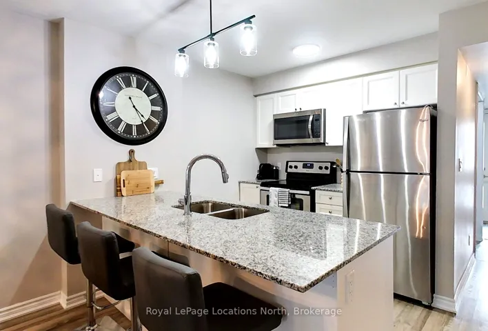 Welcome to 5 Anchorage, Unit 102, a beautifully appointed ground-floor condo in the sought-after waterfront community of Wyldewood Cove. This 2-bedroom, 2-bathroom suite is the perfect four-season retreat or full-time residence. Enjoy views of Georgian Bay right from your living room and seamless indoor-outdoor living with a walkout to a private covered terrace. The open-concept layout features a stylish kitchen with ample storage, a cozy dining/living area with a gas fireplace, and large windows that bathe the space in natural light. The primary bedroom includes a 4-piece ensuite, while the second bedroom and a 3-piece bath are just steps away. With in-suite laundry, private storage, and the option for shared watersport storage, everything you need is right here. Whether you’re looking for a place to relax or a home base for your adventures, this location delivers. Step off your terrace and stroll to the waterfront, the heated year-round pool, or the fitness centre. Dip your toes in the bay, launch your paddleboard, or explore nearby hiking and biking trails, golf courses, ski hills and beaches. Situated just minutes from downtown Collingwood and the Village at Blue Mountain, you’ll have easy access to shopping, dining, entertainment and lots of outdoor activities. Don’t miss your chance to own this incredible slice of Georgian Bay life.