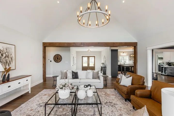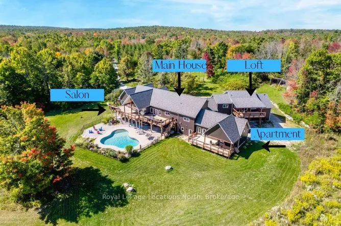 FAMILY COMPOUND | Built in 2022, this expansive 9,000 sqft estate on 100 acres is ideal for multi-generational living, family compound use, or rental income potential. The property includes a custom main residence, a legal ranch-style accessory apartment with private laundry & a self-contained loft suite above a heated 4-car garage, offering exceptional flexibility. A grand foyer flows into a stunning living room featuring floor-to-ceiling windows & expansive panoramic views of the acreage. The main home features 3+2 bedrooms, 3 full & 2 half bathrooms, 9′ ceilings & engineered hardwood throughout the main level. The great room showcases 19′ vaulted ceilings with walk-out access to a covered deck overlooking the pool.The chef’s kitchen & formal dining area are designed for entertaining, complete with quartz countertops, oversized custom island, double farmhouse sink, and premium stainless steel appliances. The primary suite is a private retreat with deck access, dual walk-in closets & a spa-inspired 5-piece ensuite featuring a soaker tub, walk-in shower, dual quartz vanity & private water closet.The walk-out lower level includes a large recreation room, two additional bedrooms & a dedicated salon with powder room, ideal for a home business, studio, or professional workspace, finished with durable vinyl plank flooring.The legal accessory apartment offers vaulted ceilings, an open-concept layout, quartz kitchen counters, private covered deck & in-suite laundry – perfect for extended family or income-generating rental use. The loft suite includes a bedroom, 4-piece bath, kitchenette & private deck for guests or independent living.The heated 4-car garage features 10′ and 14′ ceilings, ideal for car enthusiasts, storage, or workshop use. Outdoors, the 100-acre property supports hiking trails, hobby farming, recreational use, or a private nature retreat. Enjoy a resort-style outdoor setting with a heated 20′ x 40′ saltwater pool, multiple decks & expansive green space.