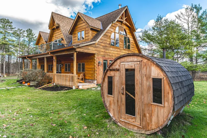 LUXURY MEETS PRIVACY WITH THIS BEAUTIFUL LOG HOME ON 100 ACRES WITH OWNED SOLAR PANELS & MULTIPLE OUTBUILDINGS INCLUDING AN OVERSIZED HEATED TRIPLE CAR GARAGE, SAUNA, SHED, GREENHOUSE, CHICKEN COOP, PUMP HOUSE, HUNT CAMP & BUNKIE WITH IN-LAW POTENTIAL! The gate opens, the landscape unfolds, and suddenly the search you thought was ambitious starts to feel remarkably small. Set on 100 acres with private trails, tranquil ponds, forest views, owned solar panels with battery backup and generator hookups, and a standout collection of outbuildings, including an oversized heated triple car garage with spray-foam insulation and 100-amp service, a bunkie with a kitchen and bathroom, a hunt cabin, sauna, greenhouse, shed, pump house, and chicken coop. Freshly re-stained logs and a newer wood front porch add to the arrival, while inside, extensive updates include engineered hardwood flooring, fresh paint, LED pot lights, refinished stairs and railing, replaced door hardware, central vac, water filtration, and upgraded energy-efficient windows in select areas. The main level features a family room with a propane fireplace, two bedrooms with walkout access, including a spacious primary suite with a 5-piece ensuite, a 3-piece bathroom with heated floors, and a flexible office or den. Upstairs, vaulted ceilings open up the living space, where the upgraded kitchen features quartz countertops, a tile backsplash, updated cabinet hardware, a large island, and a newer dishwasher, flowing into the open dining area and great room with a wood-burning fireplace, oversized windows, and a walkout to a balcony overlooking the surrounding forest. A third bedroom and renovated 5-piece bathroom complete the upper level, while outside, fruit trees, gardens, a hot tub, a gazebo, a newer gated entrance, and camera security add even more appeal. Close to Hwy 11, Lake Couchiching, Washago, schools, and Orillia amenities, this is the one buyer’s picture when they say they want the country, but better.