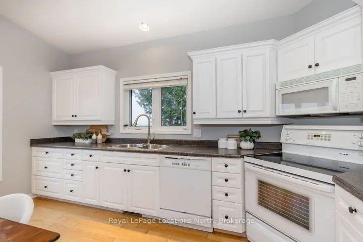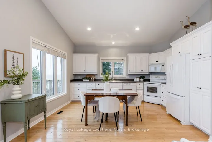 Welcome to a true Georgian Bay waterfront retreat, where unobstructed water views deliver unforgettable sunrises, sunsets, and year-round scenery. Built in 2002, this 4-bedroom, 3-bathroom bungalow was intentionally designed to maximize panoramic bay and Blue Mountain views from the main living areas. Perfectly positioned between Collingwood and Wasaga Beach, the location offers peaceful waterfront living with quick access to skiing, trails, dining, shopping, and four-season recreation.The covered front porch sets the tone – ideal for morning coffee or watching summer storms roll across the bay. Inside, the open-concept main floor is filled with natural light, vaulted ceilings, and a cozy gas fireplace anchoring the living space. The spacious kitchen offers generous counter space and storage, making it ideal for entertaining family and guests while enjoying water views. The main-floor primary suite provides a private retreat with a 4-piece ensuiteincluding a soaking tub, stand-up shower, and walk-in closet. The lower level features two additional bedrooms and a large rec room, creating flexibility for family living, guests, or cottage use.Outdoors, enjoy tiered decks, mature landscaping, and direct private waterfront access-perfect for swimming, kayaking, paddle boarding, or relaxing by the water. Whether used as a full-time residence or waterfront cottage, this home captures the essence of the Georgian Bay lifestyle: tranquil, active, and deeply connected to nature, with winter skiing and summer water sports at your doorstep.